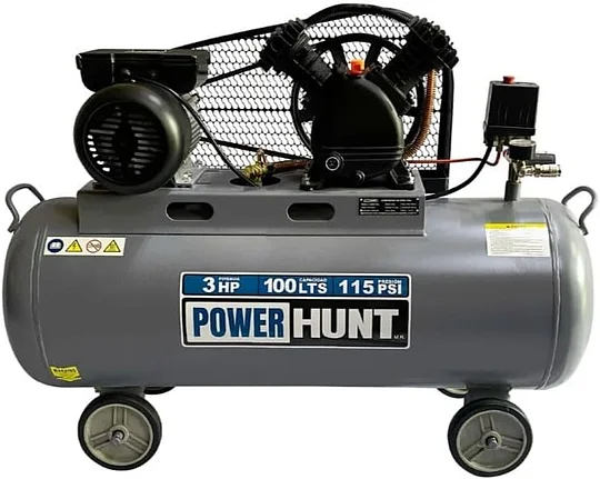 Compresor De Aire Eléctrico Portátil 100lts Power Hunt 3hp con banda y doble conexión rapida, presion de 8 bar/ 115 psi