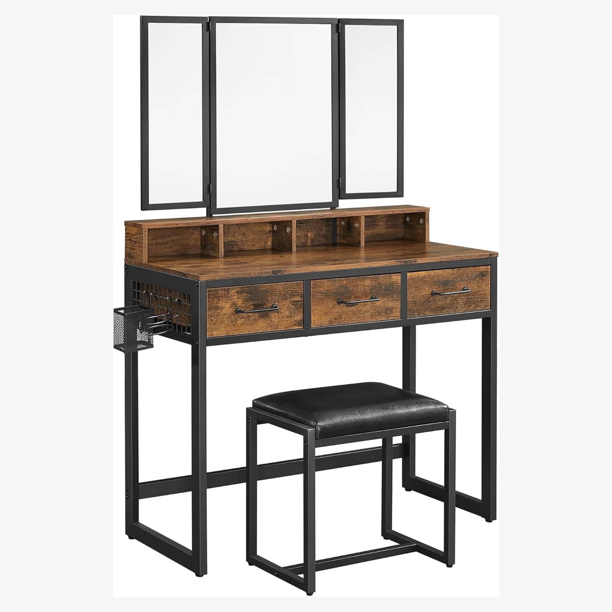 Juego de Mesa de Maquillaje con Espejo Triple, Tocador con Espejo y Taburete, 3 Cajone.