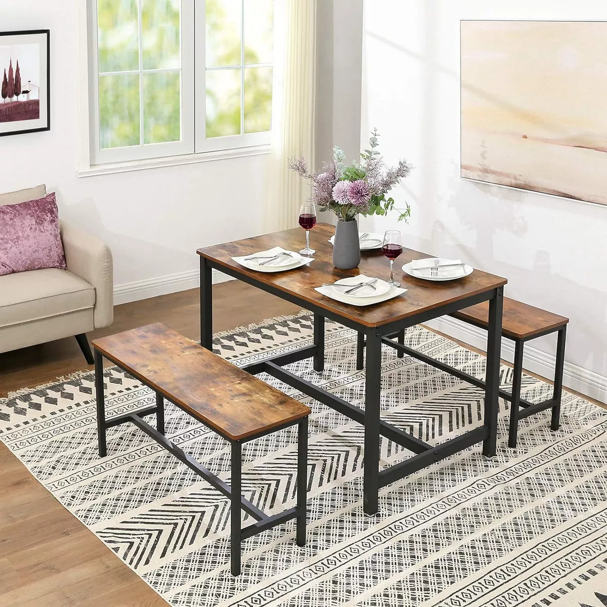 Juego De Comedor Rectangular Marrón Con 2 Bancos Para 4 Pers Color Marrón oscuro Diseño de la tela de las sillas Liso