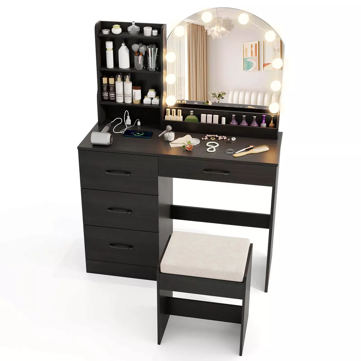 Costway Juego de tocador con espejo y luces, tocador y silla, 4 cajones, 3 estantes abiertos, negro/blanco