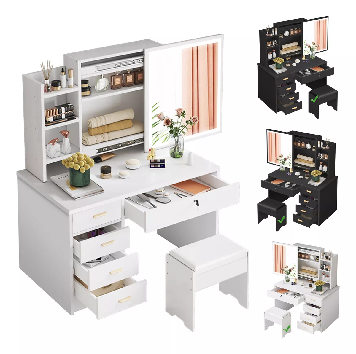 Escritorio blanco con espejo y luces, tocador de maquillaje, juego de tocador de
