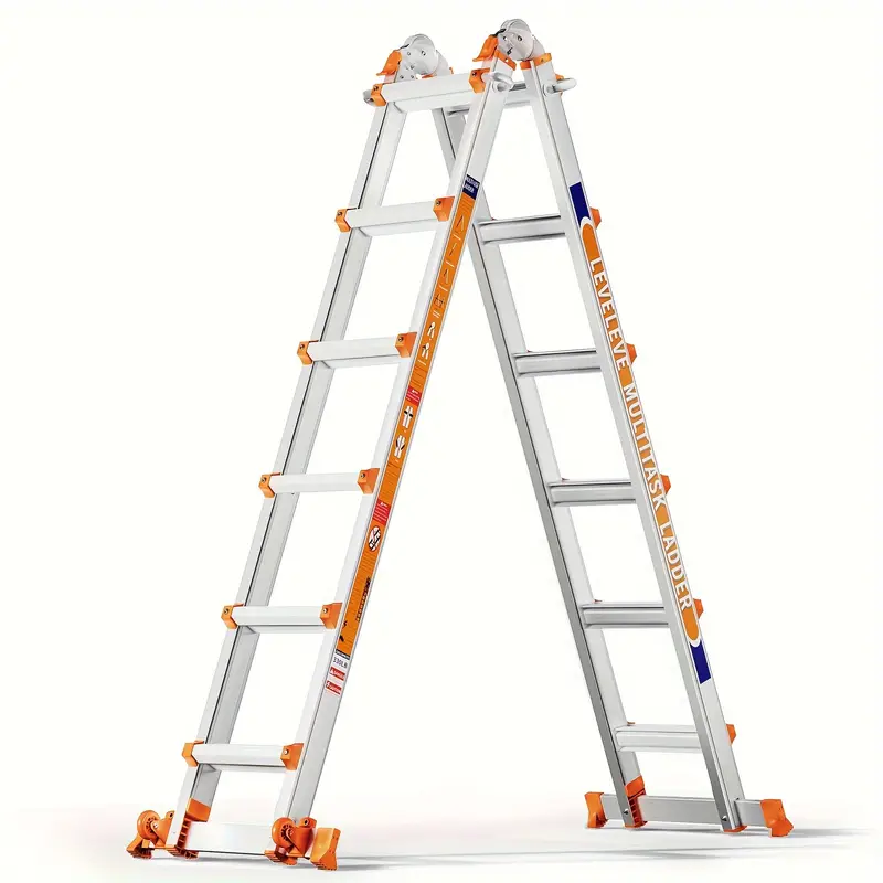 Escalera extensible de aluminio resistente de 17 pies con barra estabilizadora y ruedas, capacidad de 330 libras, múltiples posiciones para uso interior y exterior, techo y escaleras, diseño naranja y blanco