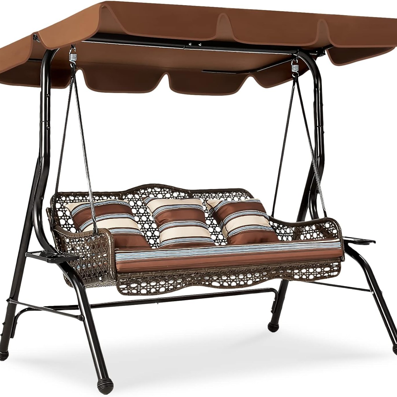 AECOJOY Columpio de mimbre de 3 asientos, columpio de patio con dosel, 2 bandejas laterales, 3 almohadas y cojín extraíble, columpio de mimbre para patio con soporte columpios al aire libre para adultos, balcón, jardín, terraza (ratán marrón)