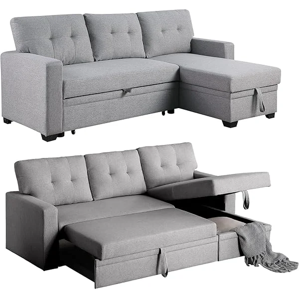 Sofá seccional en forma de L, sofá cama con chaise, sofá cama reversible con cama extraíble y espacio de almacenamiento, sofá convertible de tela de 4 asientos, adecuado para sala de estar, gris claro