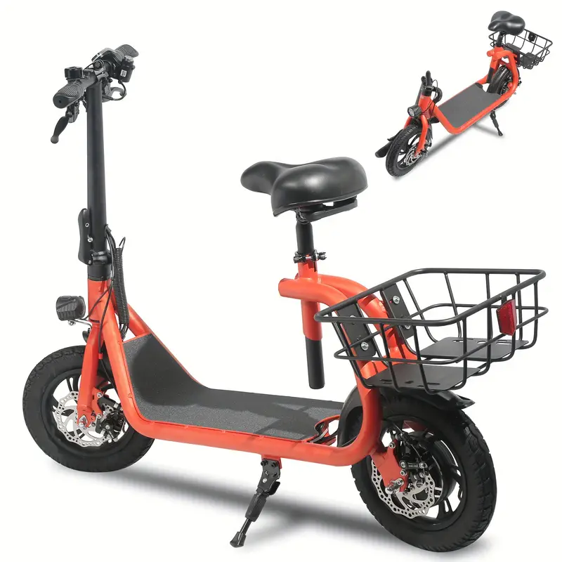Scooter eléctrico plegable rojo con asiento para adultos, alcance máximo de 20 millas, 15,5 MPH, potencia máxima del motor de 630 vatios, neumáticos de 12 pulgadas, asiento ajustable, faro LED, bicicleta eléctrica para desplazamientos para adultos