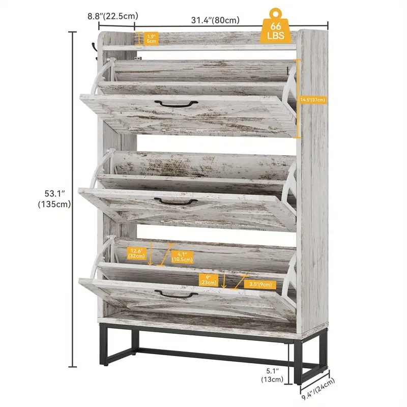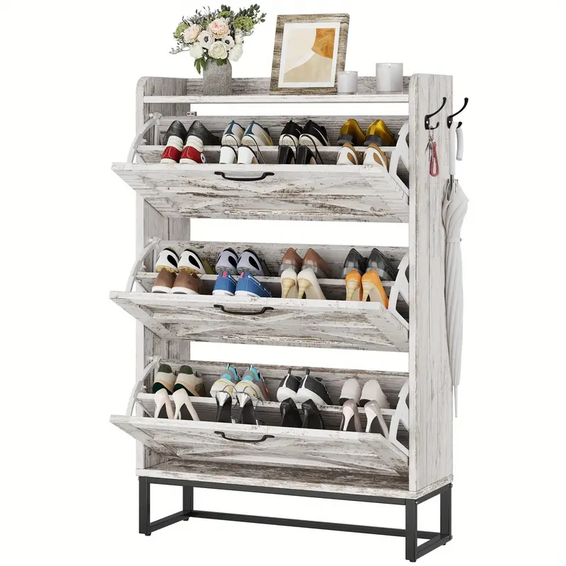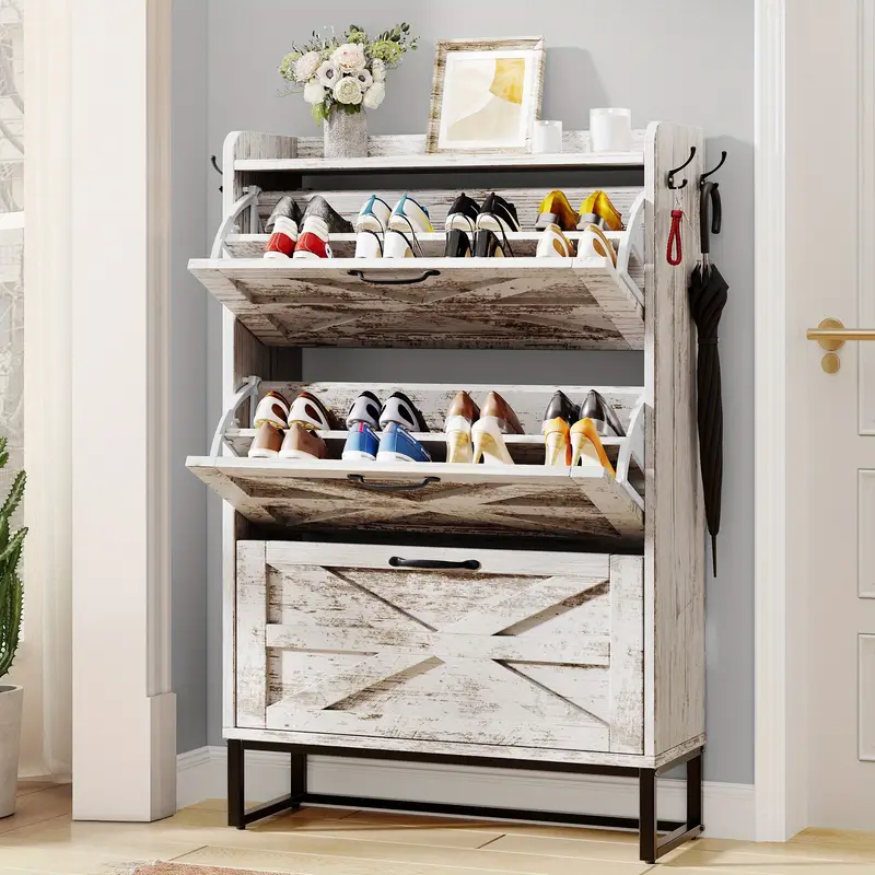 Armario de almacenamiento de zapatos estilo granja con 3 cajones abatibles, organizador de zapatos independiente para 24 pares, zapatero estrecho y delgado para entrada