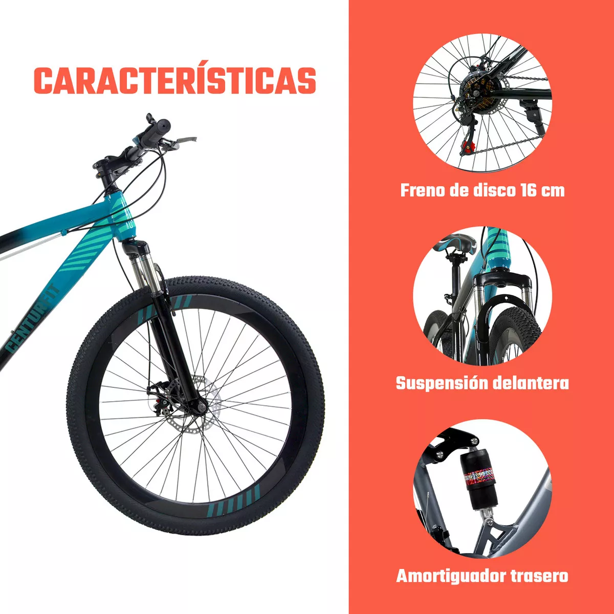 • SISTEMA DE AMORTIGUACIÓN Y LLANTAS. Integra dos amortiguadores delanteros para darle estabilidad a la bicicleta en suelos irregulares. Las llantas están fabricadas con nylon 26 X 2.125 (57 – 559) etc.