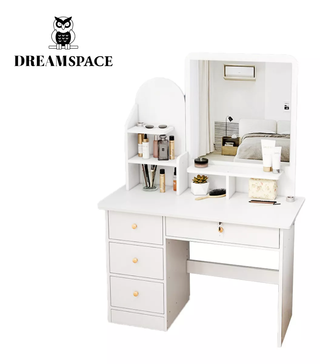 Tocador de Diseño Minimalista con Espejo Vestidor, 4 Cajones y Mucho Espacio de Almacenaje. Los materiales principales son el MDF y el metal.
