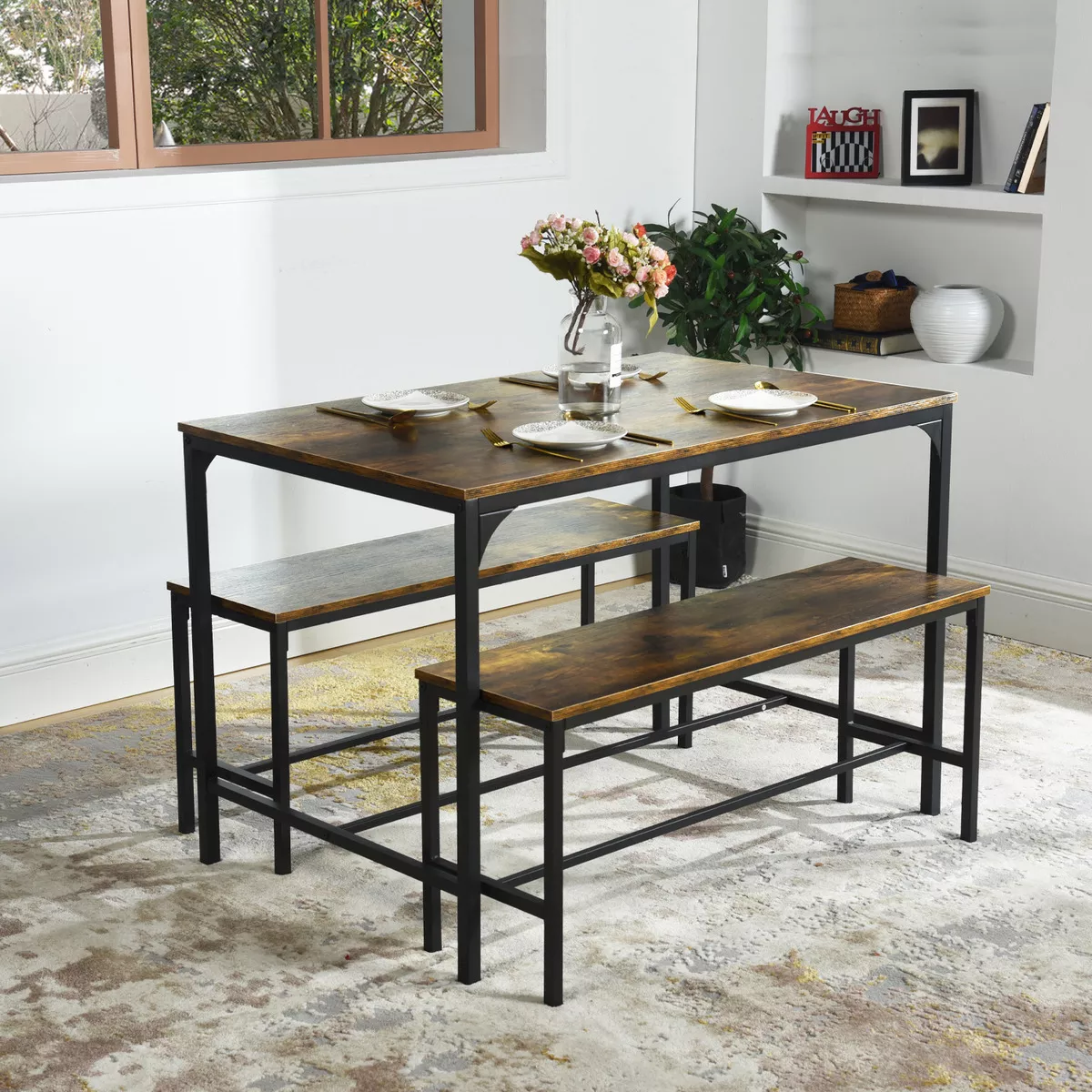 Juego de mesa de comedor de 3 piezas: incluye 1 mesa de comedor y 2 bancos, con capacidad para 2-4 personas, permitiendo disfrutar de momentos para cenar y beber con familia o amigos en casa.