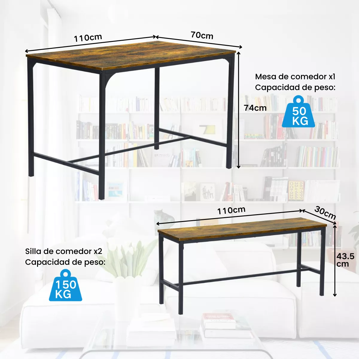 Mesa grande y cómoda experiencia para sentarse: la mesa mide 110 cm x 70 cm, ofreciendo suficiente espacio para colocar vajillas, platos, tazas y más. Los bancos miden 100 cm x 30 cm x 43,5 cm, ajustándose al diseño ergonómico para una sentada cómoda durante períodos prolongados.