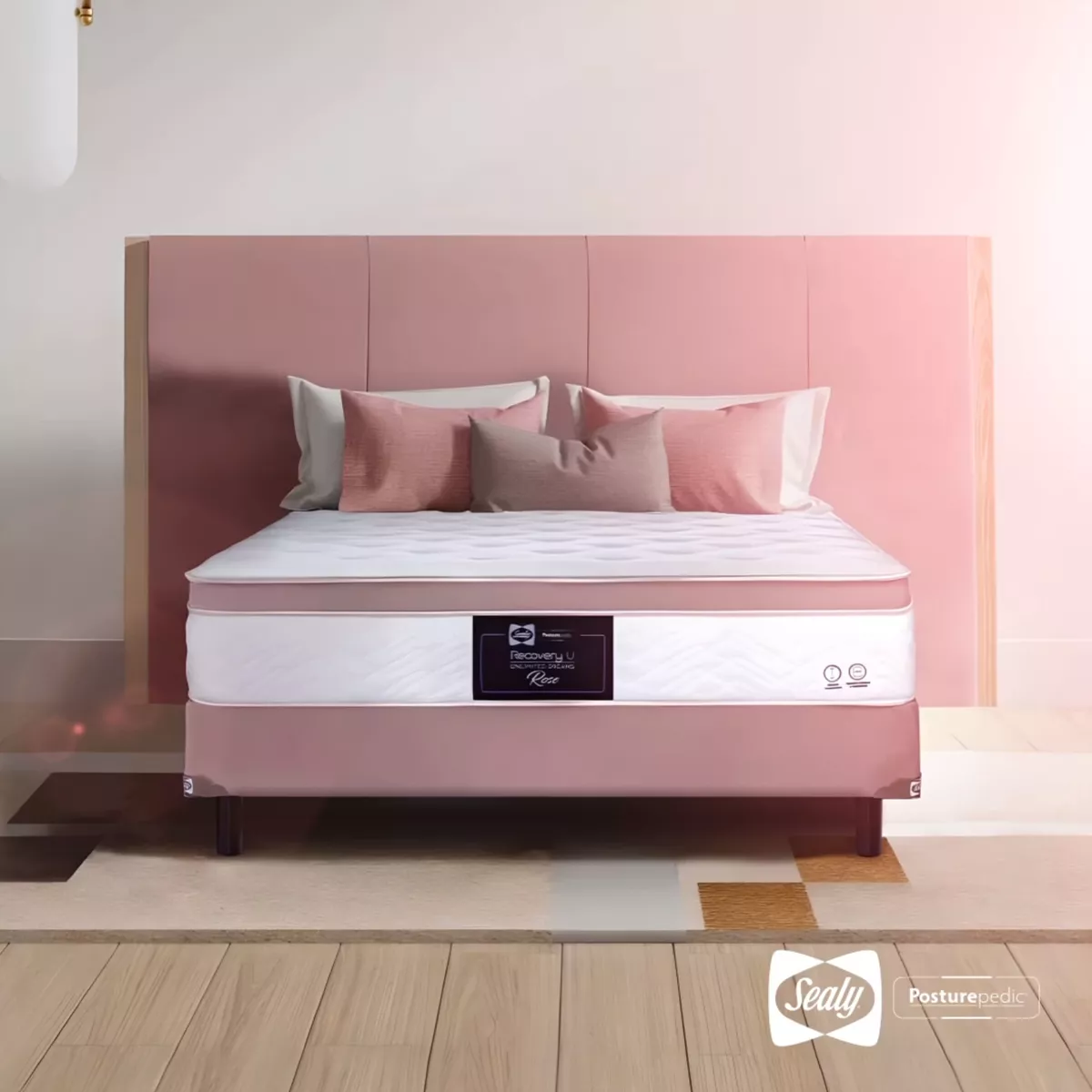 Para quien sueña a lo grande, creamos Sealy Recovery U, la nueva línea de descanso especialmente desarrollada para quien lo merece todo. Colchón Rose con resortes Posturetech diseñado y patentado por Sealy, gracias a su brazo sensor ofrece el soporte necesario en cada zona del cuerpo, soporte lumbar y perimetral, se encuentra en la primera y segunda hilera de resortes, así como en el área lumbar, brindan soporte adicional a las áreas más pesadas del cuerpo.