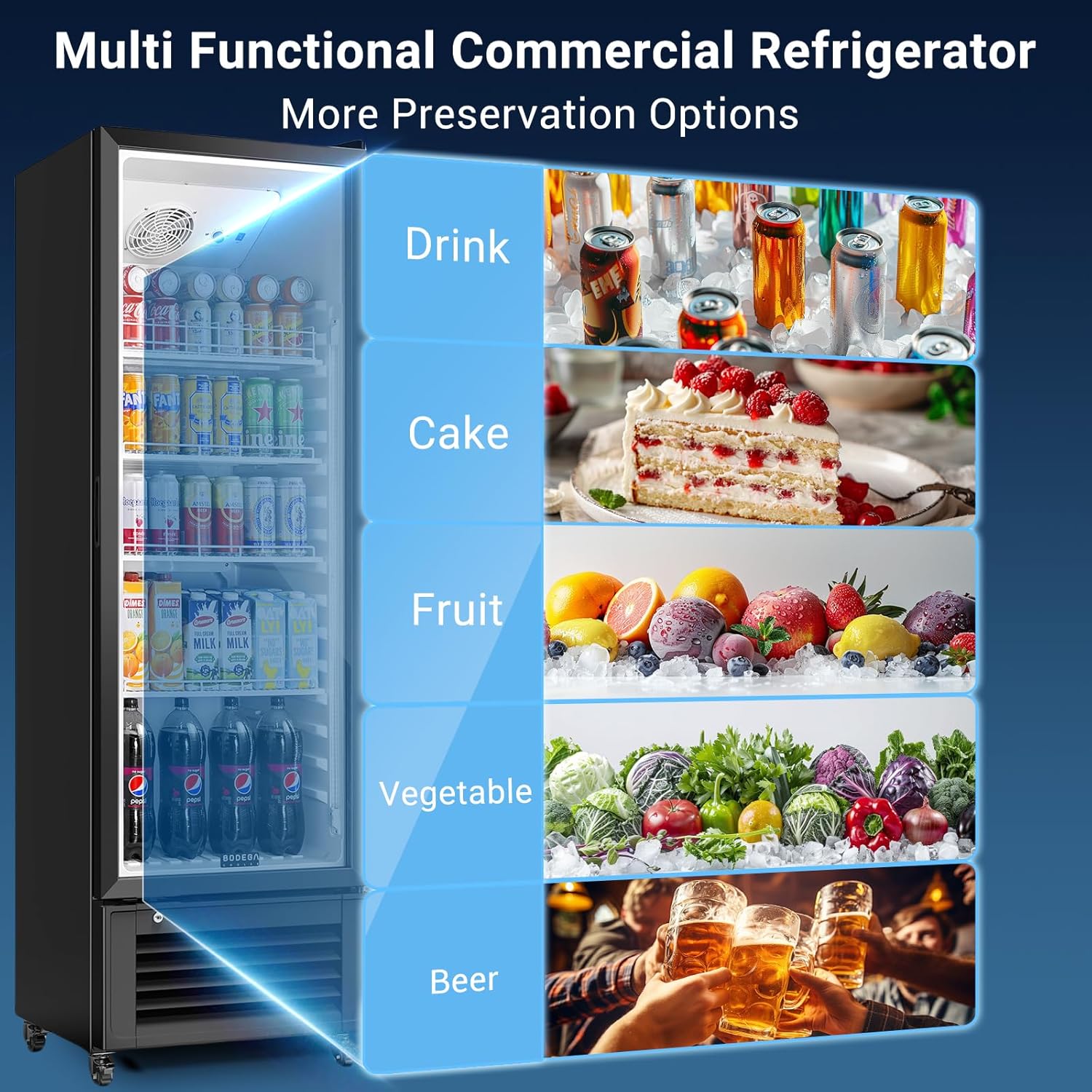 - Amplia nevera comercial: el refrigerador comercial BODEGACOOLER con puerta de vidrio no adopta un diseño de caja de luz, lo que aumenta el espacio de almacenamiento en un 20% y puede almacenar más cerveza y bebidas. Los refrigeradores comerciales están equipados con 4 estantes ajustables, proporcionando opciones de almacenamiento flexibles, y el divisor superior de bebidas puede evitar eficazmente que las bebidas se deslicen. Cada capa está diseñada con cuatro hebillas de inserción, lo que te permite ajustar fácilmente la estructura de altura interna.