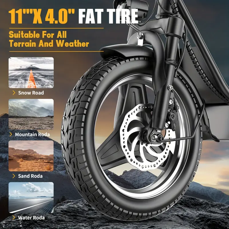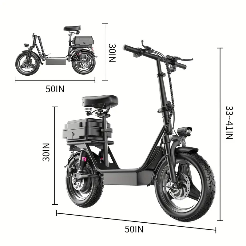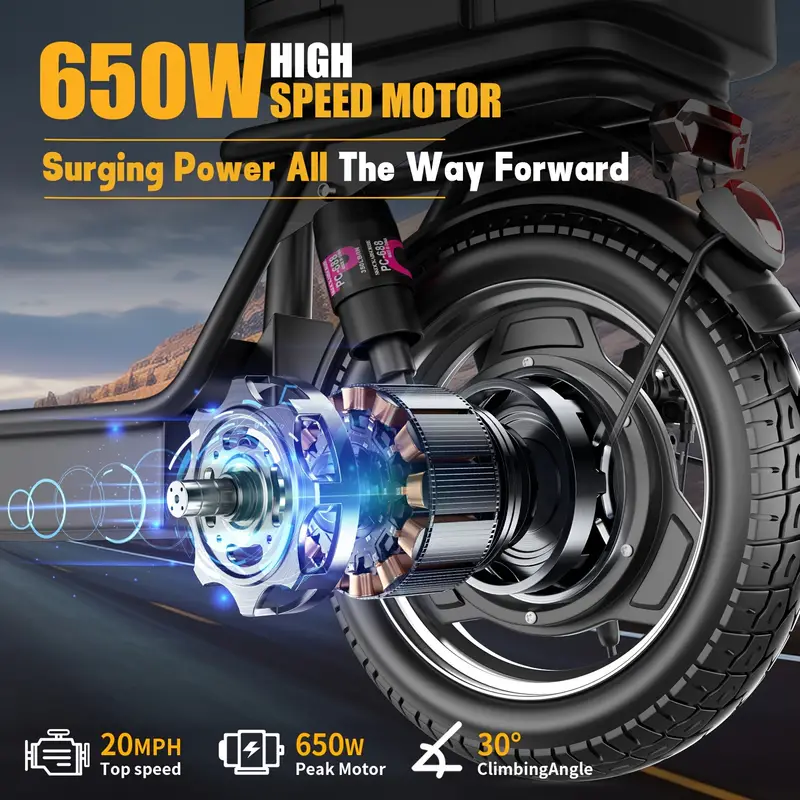 Patinete eléctrico para adultos, patinete eléctrico con asiento, motor de 500 W pico 650 W, hasta 20 MPH y 30 millas de autonomía, batería de 36 V 13 AH, neumático de 14 pulgadas, con caja trasera