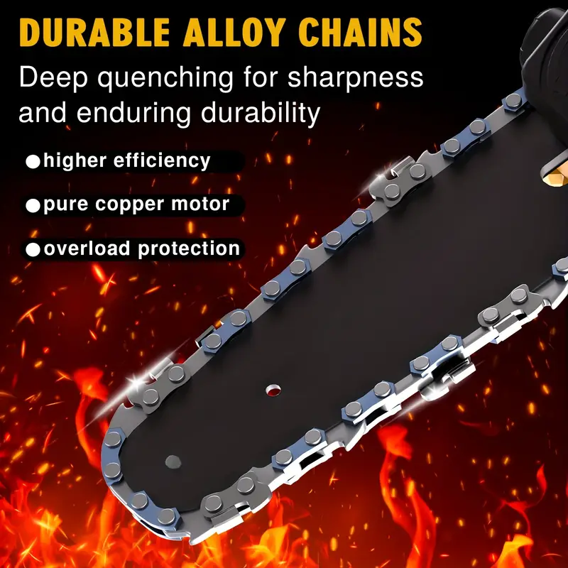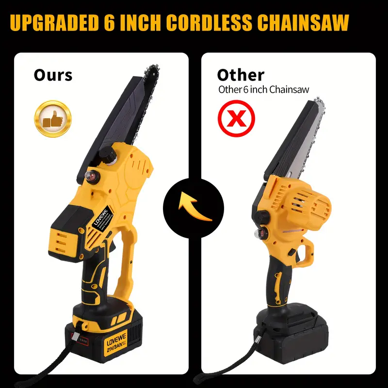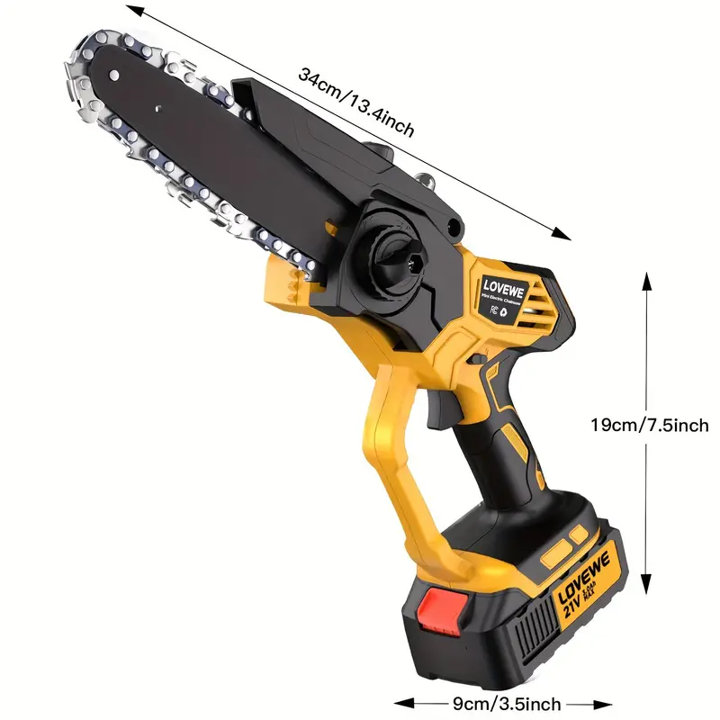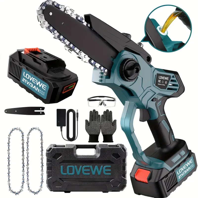 LO QUE OBTIENES 1 X Cargador 1 X Batería de 3.0Ah 1 X Mini motosierra de 6 pulgadas 1 X Placa guía de 6 pulgadas 2 X Cadenas de 6 pulgadas 1 X Maleta 1 X Par de guantes 1 X Par de gafas
