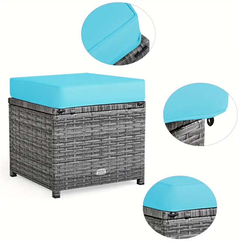 Color de los cojines: Turquesa. Color del ratán: mezcla de gris. Material: ratán, acero, esponja, tela de poliéster, madera plástica. Dimensiones de la silla esquinera: 45" x 23,5" x 28" (largo x ancho x alto). Dimensiones de la otomana: 15" x 15" x 12" (largo x ancho x alto). Dimensiones de la mesa: 52" x 30" x 26" (largo x ancho x alto). Dimensiones del cojín del asiento más grande: 43" x 21" (largo x ancho). Dimensiones del cojín del asiento más pequeño: 15" x 15" (largo x ancho). Dimensiones del cojín del respaldo más grande: 21,5" x 16" (largo x ancho).