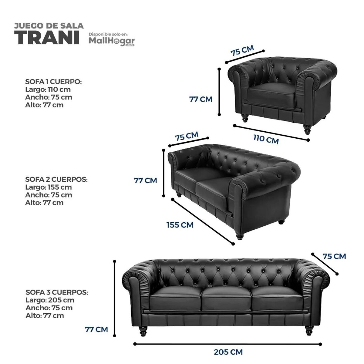 Sofá de 3: Largo 205cm x Ancho 75cm x alto 77cm