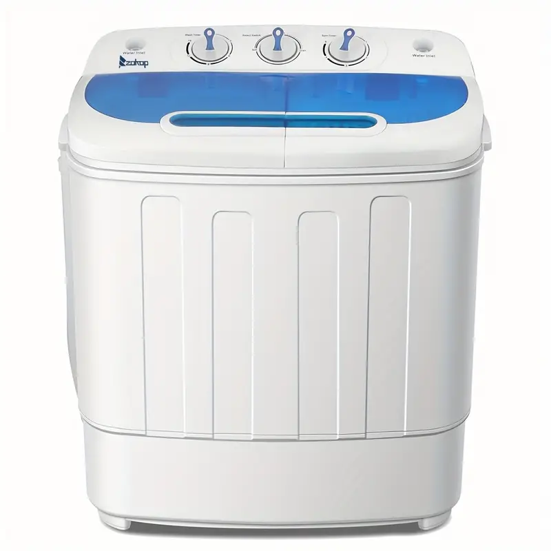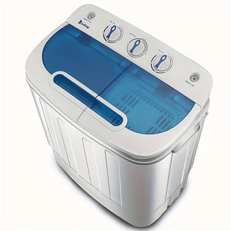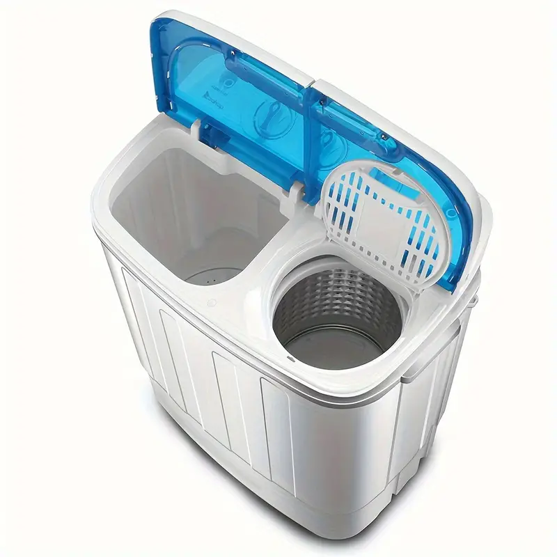 LAVADORA DE DOBLE TINA 1. Modelo: XPB46-RS4 2. Fuente de alimentación: 110V/60Hz 3. Capacidad de lavado nominal: 8 libras 4. Capacidad nominal: 5 libras 5. Potencia de entrada de lavado nominal: 300W 6. Potencia de entrada nominal: 250W 7. Potencia total: 550W 8. Color: Blanco y Azul 9. Dimensiones: (23.23 x 13.98 x 26.57)" / (59 x 35.5 x 67.5)cm (L x A x Al) 10. Peso: 11kg / 24.25 libras 11. Material: Plástico y PP 12. Tipo de enchufe: Estándar de EE. UU. 13. Velocidad del motor: 1300rpm/min