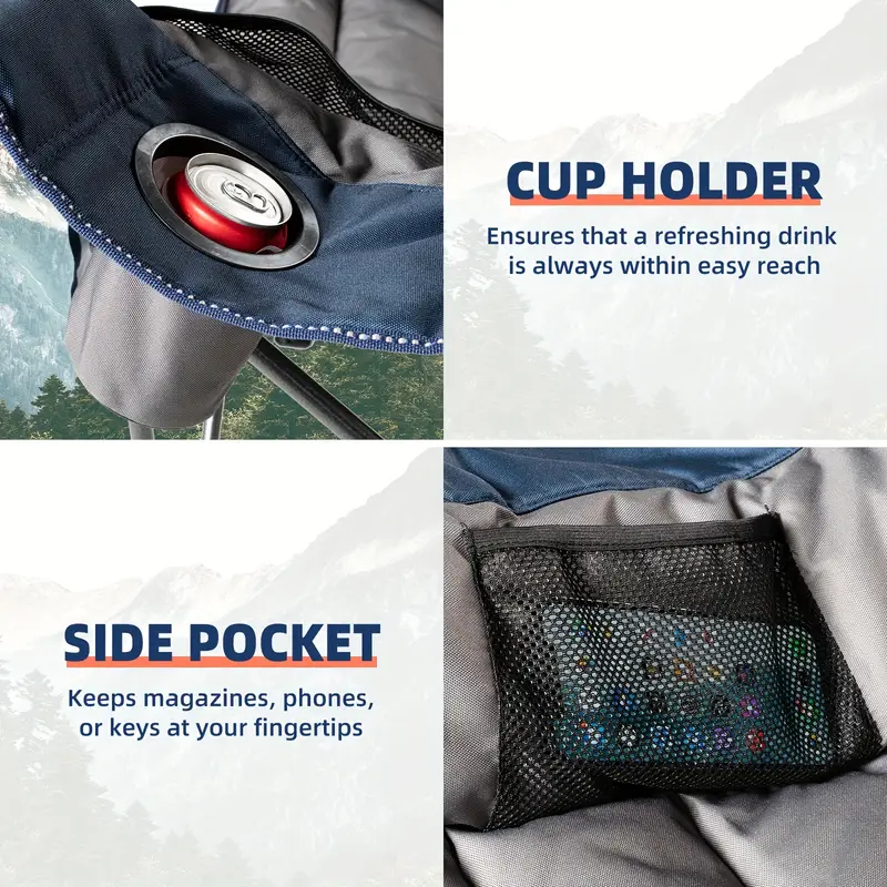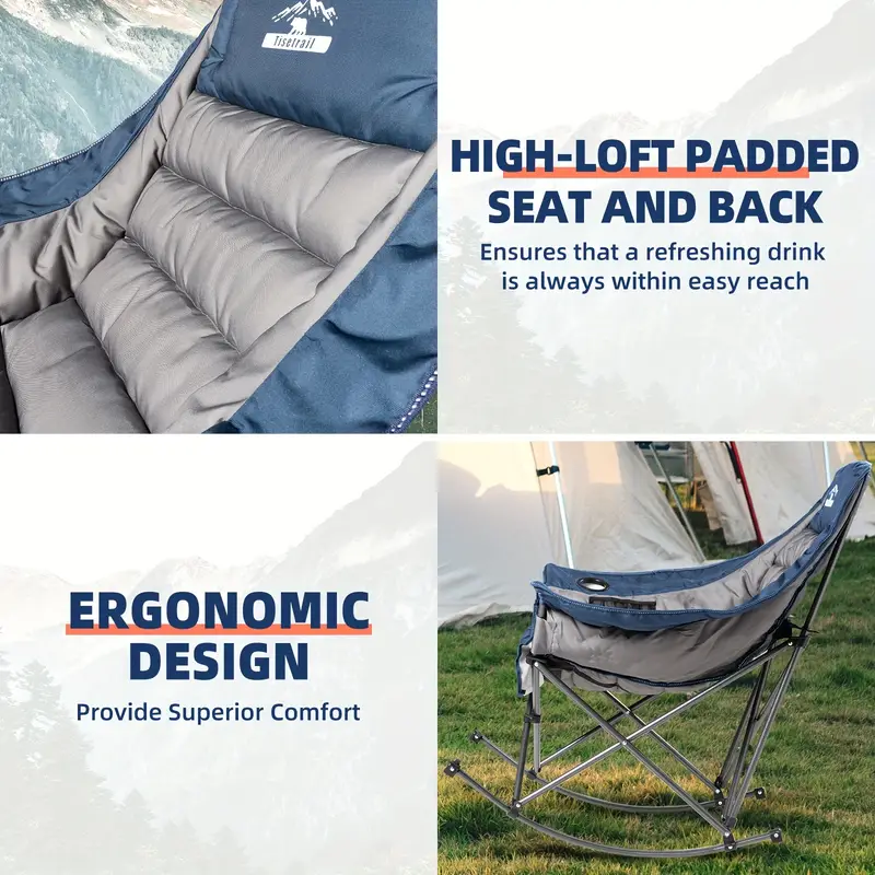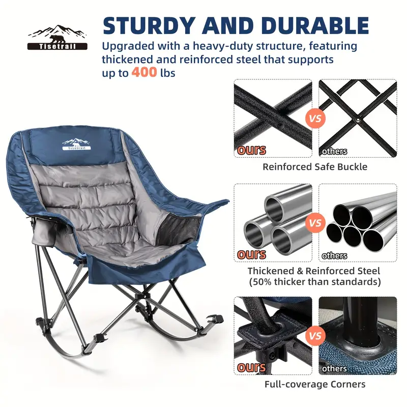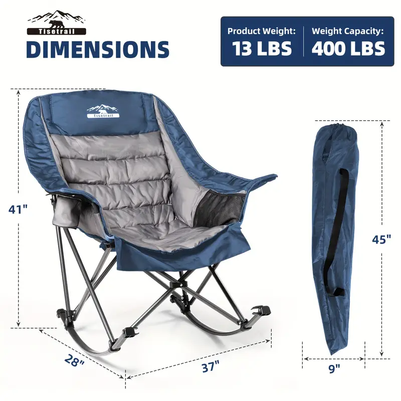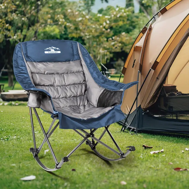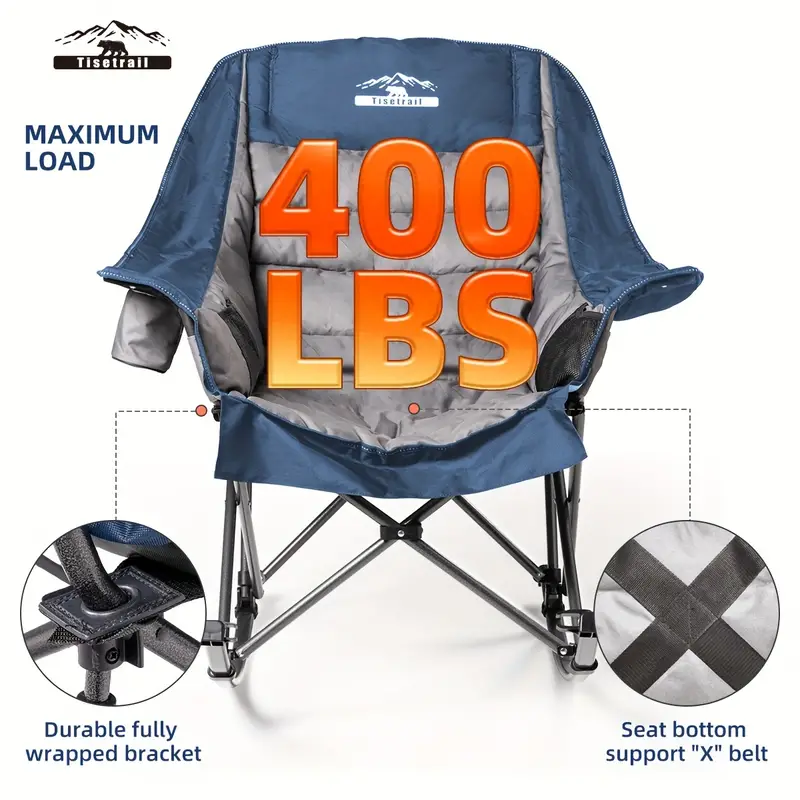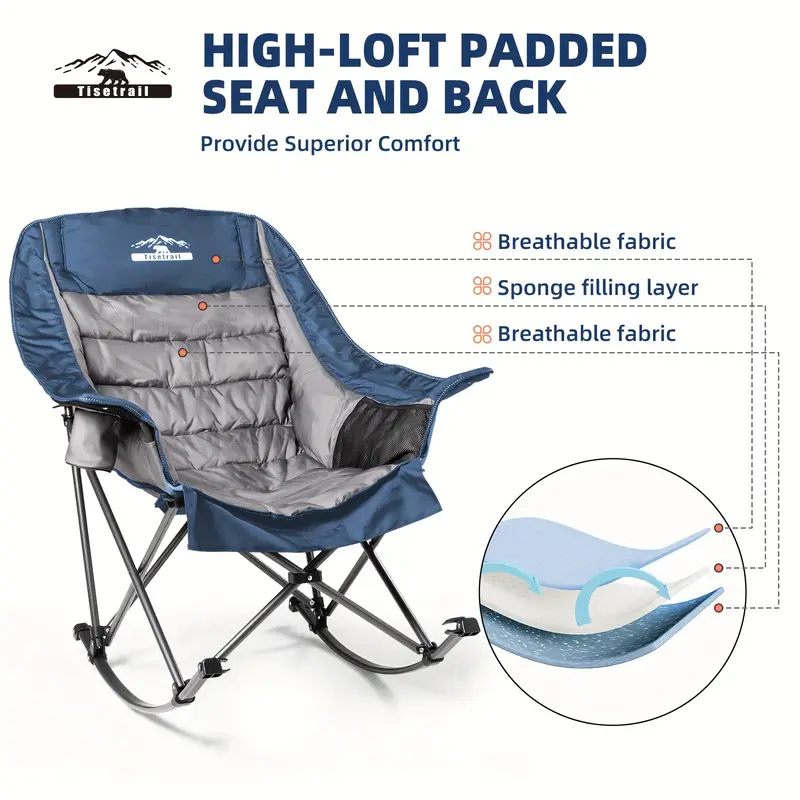 Silla de camping mecedora de gran tamaño Tisetrail, sillas de camping totalmente acolchadas para adultos con bolsillo lateral y portavasos, capacidad de 500 libras para trabajo pesado, azul y gris