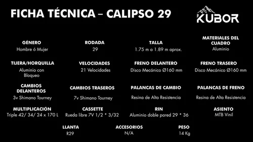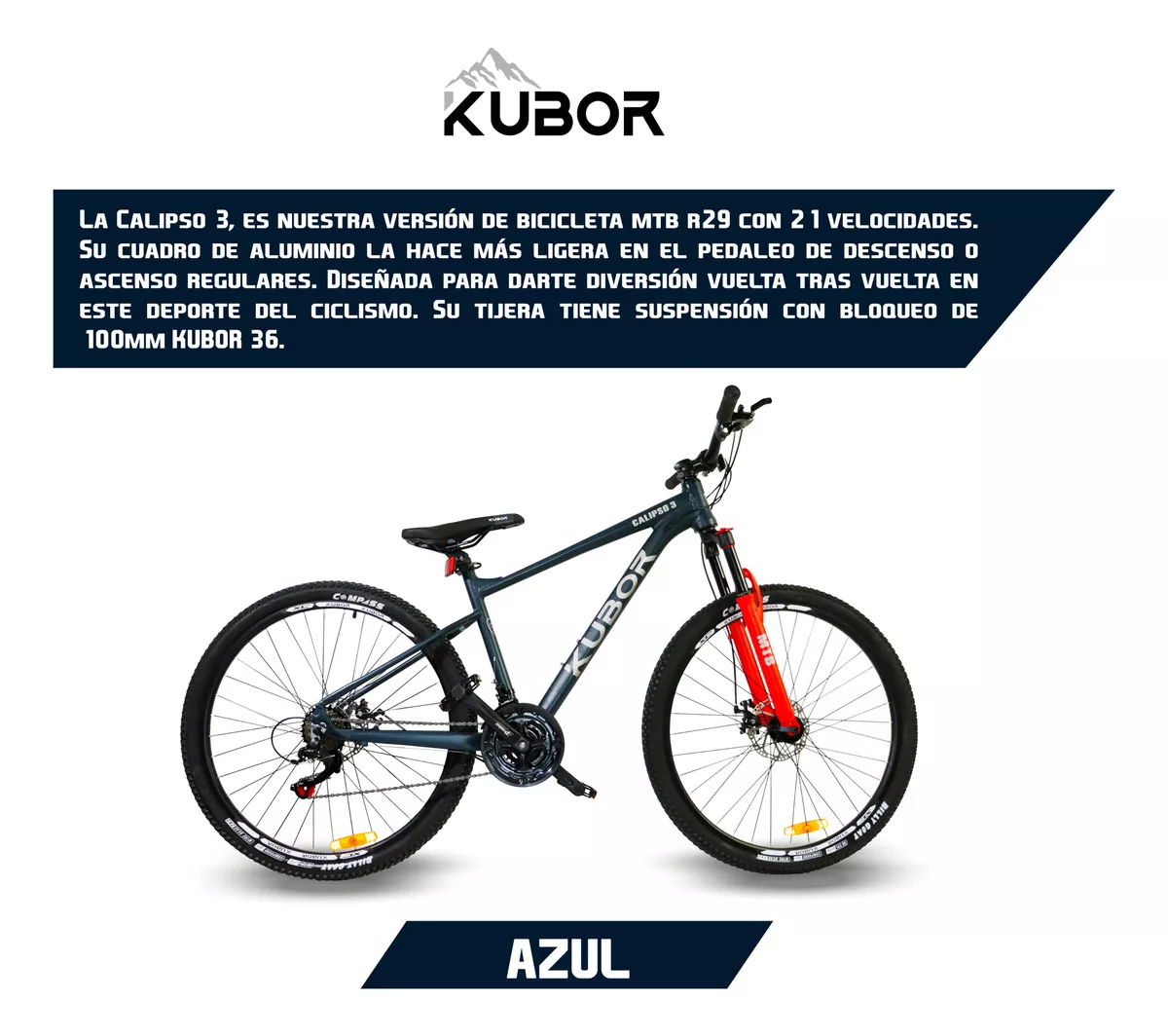 Ya seas un ciclista experimentado o alguien que busca una bicicleta confiable para adentrarse en el mundo del ciclismo de montaña, la Mountain Bike Kubor Calipso 3 R29 es la elección perfecta. Experimenta la libertad y emoción de explorar nuevos horizontes con una bicicleta que combina tecnología de punta, diseño innovador y la calidad de los componentes Shimano.