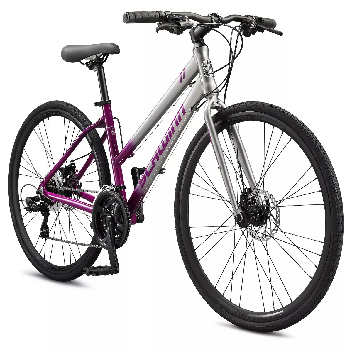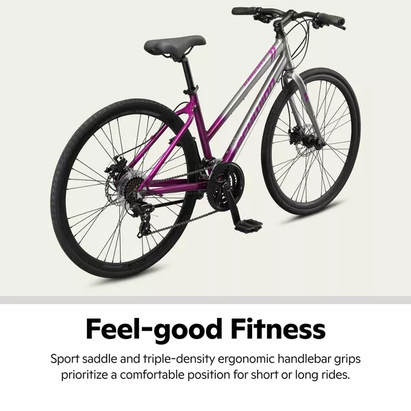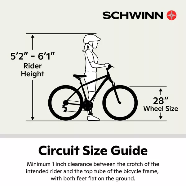 Exercise doesn't have to be a chore... hit those fitness goals and have fun along the way with the 700c Circuit by Schwinn, a sport hybrid bike that's agile and responsive yet seriously durable. Thanks to the light aluminum fitness frame, a rigid road suspension fork and 21-speed Shimano EZ-Fire shifters with a Shimano rear derailleur, the Circuit is speedy and agile for morning commutes and weekend getaway rides. Powerful mechanical disc brakes supply crisp, efficient stopping, while light and durable alloy rims support Schwinn sport tires to keep the ride smooth as silk. Toss in a cozy Schwinn fitness seat and triple-density ergonomic handlebar grips, and your new workout routine just got comfortable. The Circuit comes with a limited lifetime warranty for as long as you own the bike. Enjoy the freedom of riding a Schwinn!