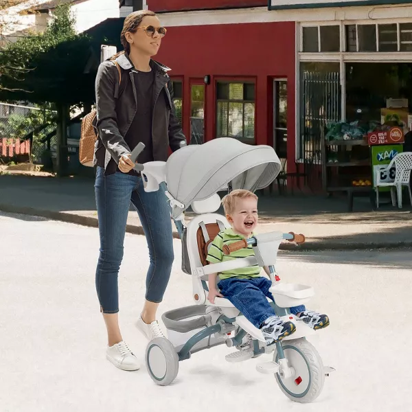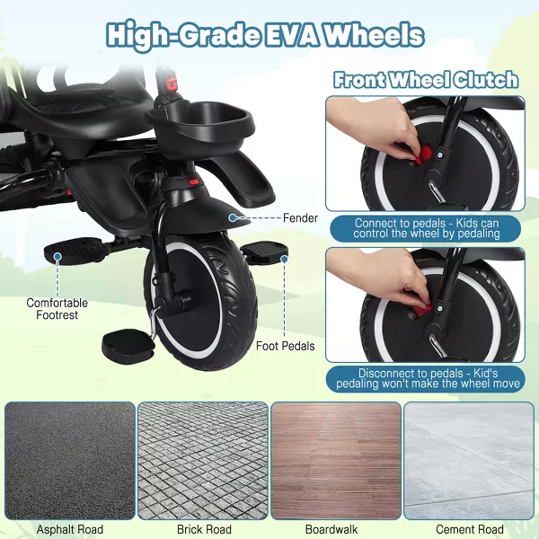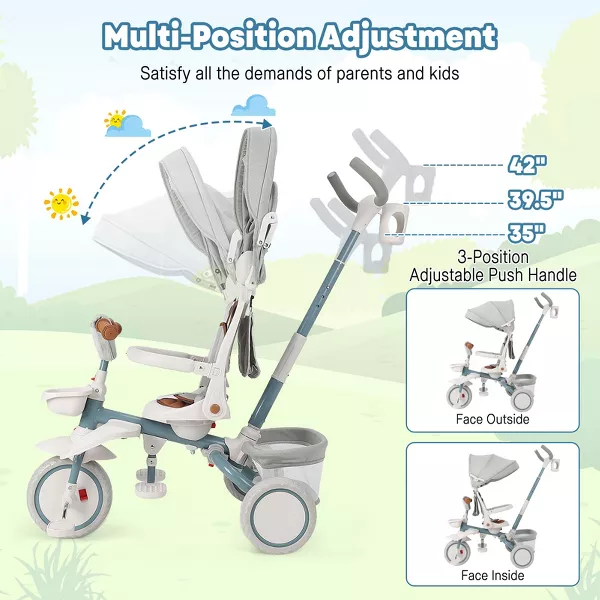 【Rotatable Seat and Adjustable Backrest】:This toddler tricycle also features a 360-degree rotatable seat, so your baby can better interact with you face-to-face. Besides, the seat can be moved forward and backward as well as tilting so that your baby can sit comfortably.