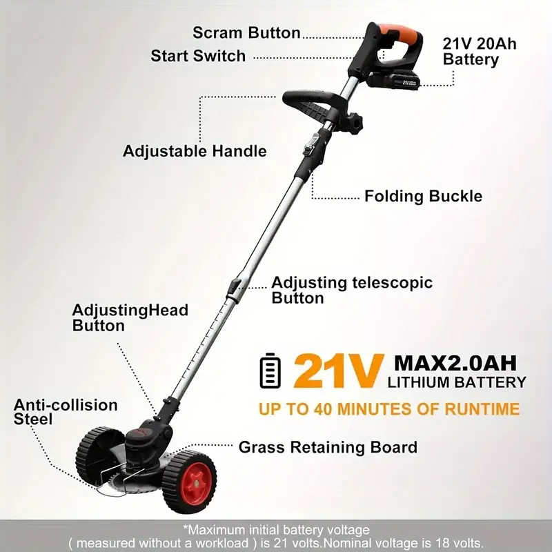 Cutting tasks become more efficient and durable with the new high-capacity batteries. Professional cordless trimmers and cutting machines feature a powerful motor and drive system, with a no-load speed of 10000RPM, to assist in clearing lawn trimming tasks. The telescopic pole is longer than typical weed wackers on the market, extending to a total length of 50 inches, suitable for taller individuals.