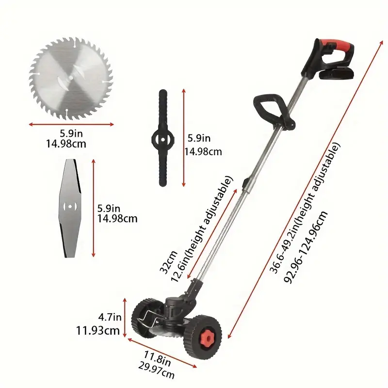 Characteristics: Product Name: Mower Material: ABS+metal Color: red+black Battery: lithium battery, 24V, 2000mAh*2 (included) Power: 650W Speed: 10000 rpm Round Blade Diameter: 150mm Straight Edge Diameter: 146mm Runtime per Battery: 45 minutes Total Runtime with Two Batteries: 90 minutes Charging Time: approximately 120 minutes