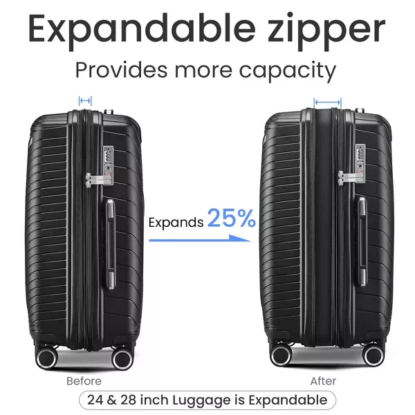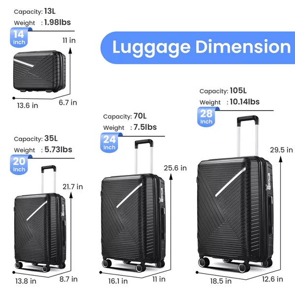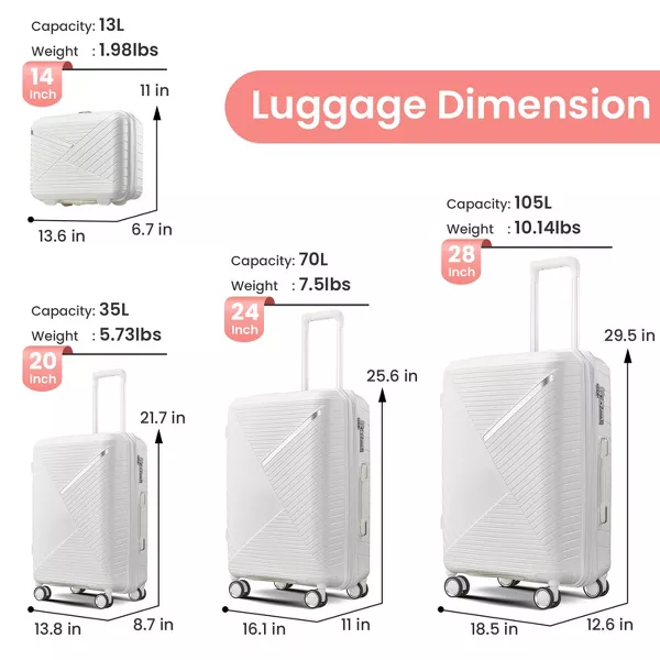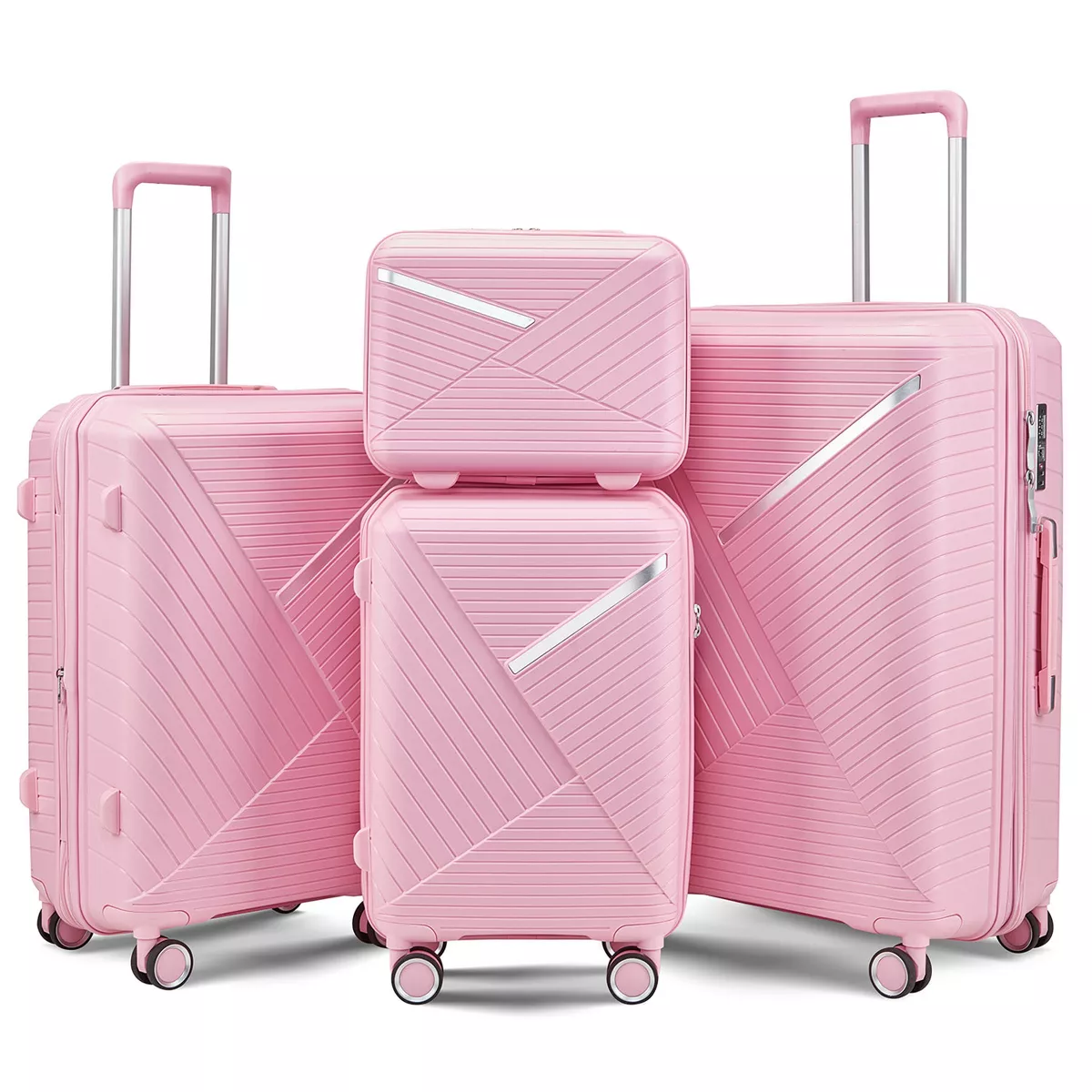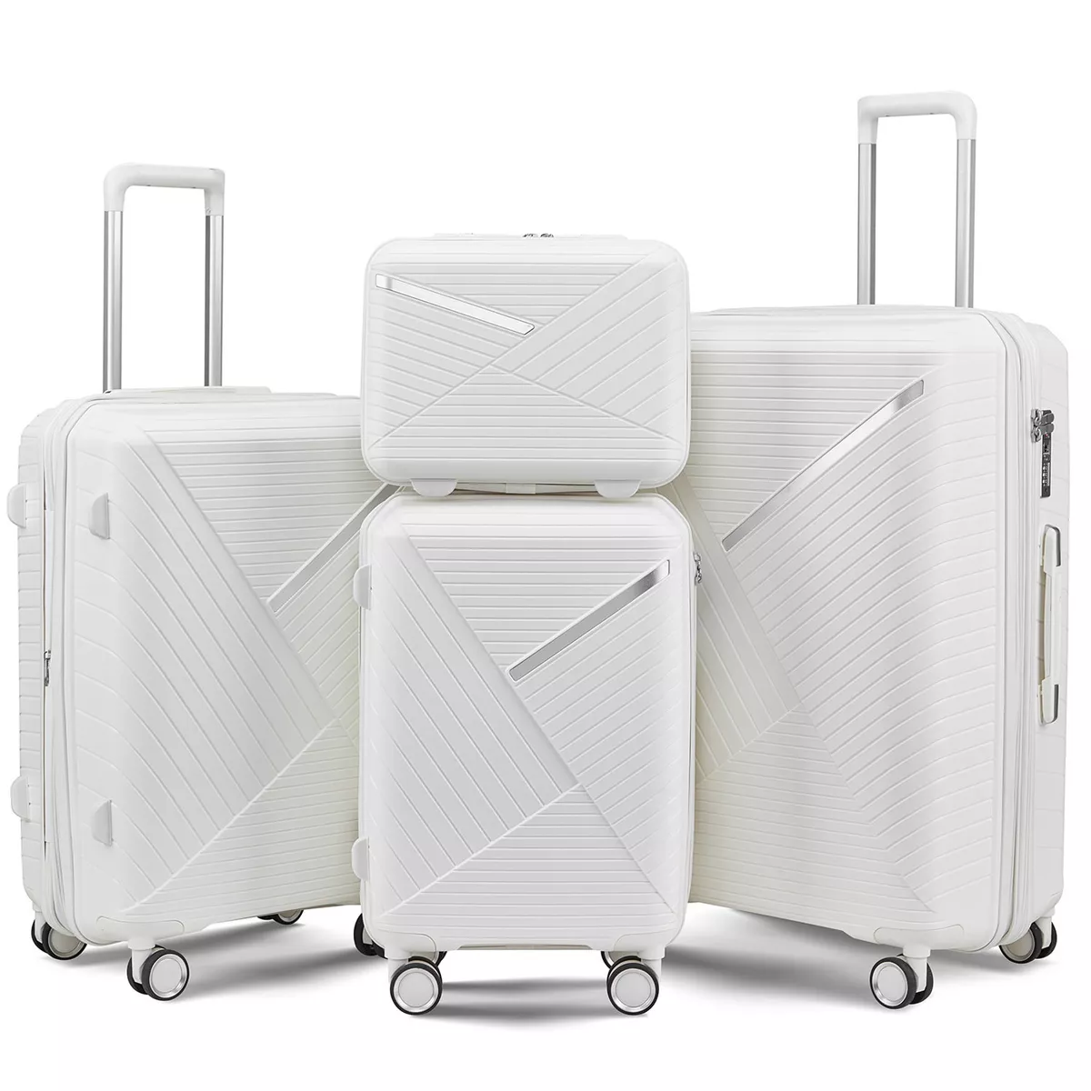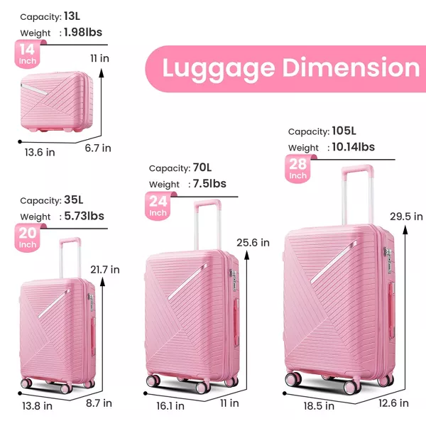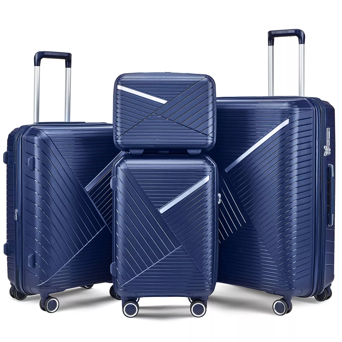 This 4-piece luggage set is crafted from durable PP material, offering a hard shell design that ensures long-lasting use and protection for your belongings. The set includes 14", 20", 24", and 28" sizes, providing versatile packing options for any trip. The suitcase features 360-degree mute spinner wheels for smooth and silent mobility, along with a TSA-approved lock for added security. Lightweight and expandable, this luggage set combines functionality and style, making it an ideal travel companion for both short getaways and extended vacations.