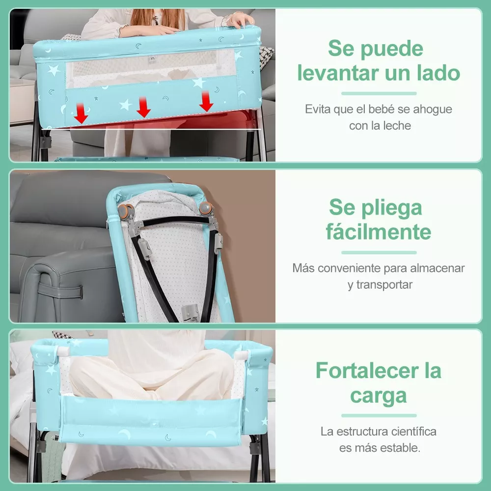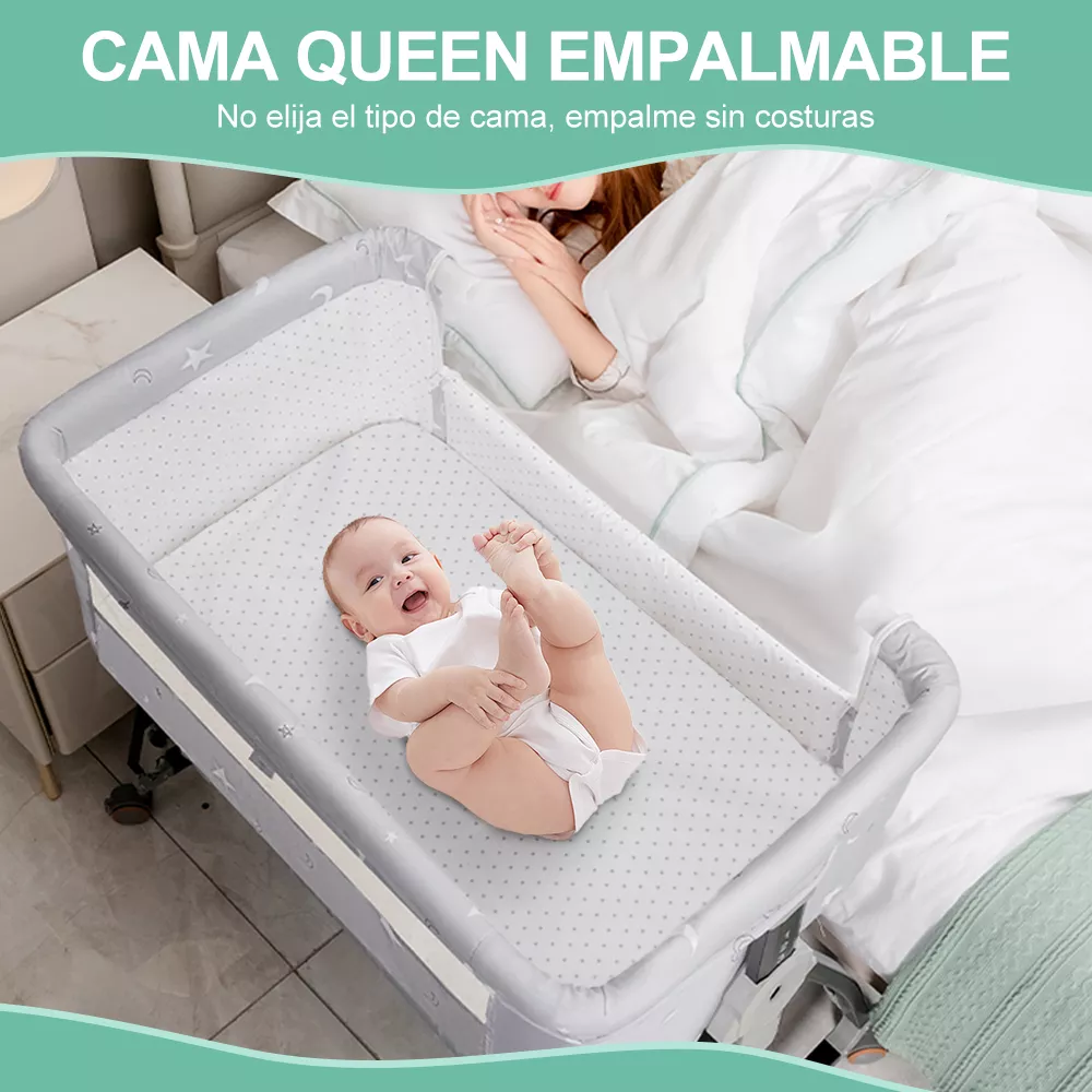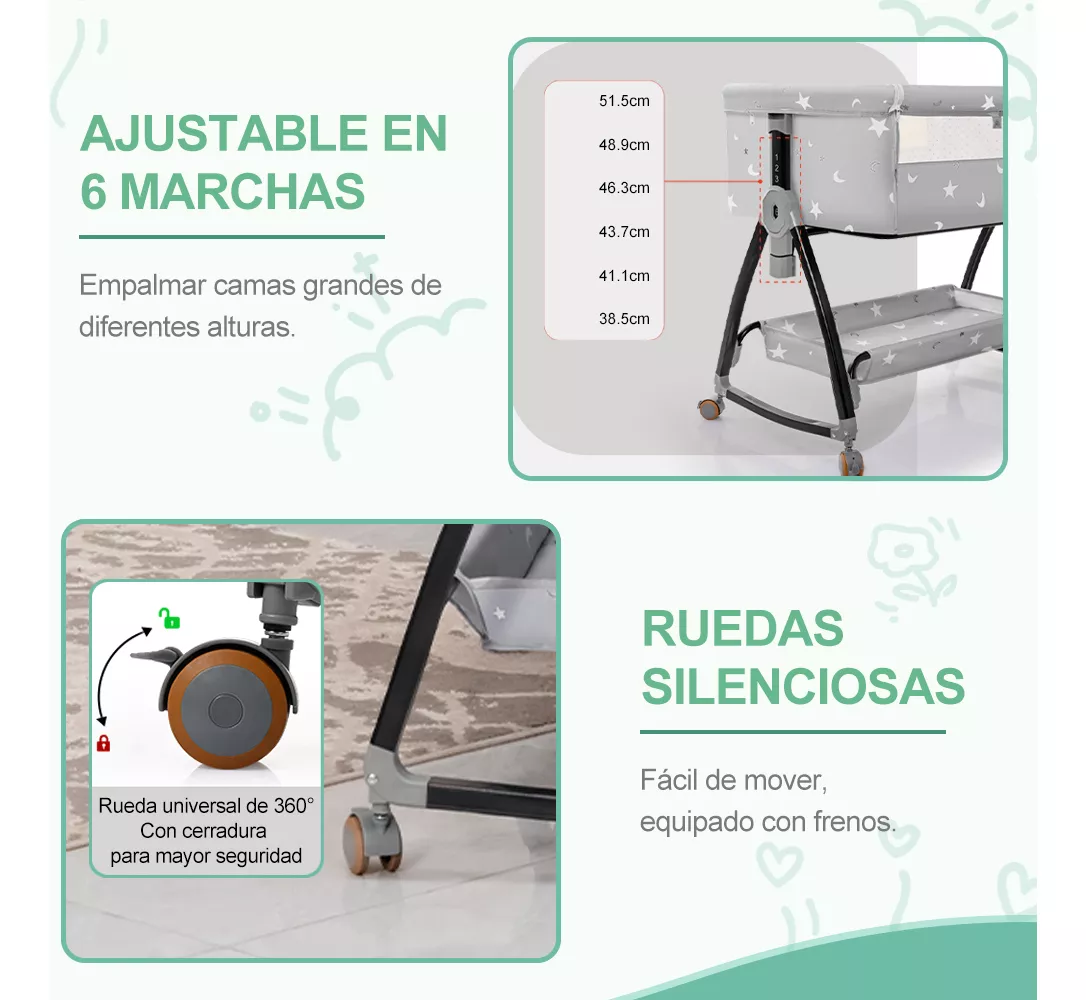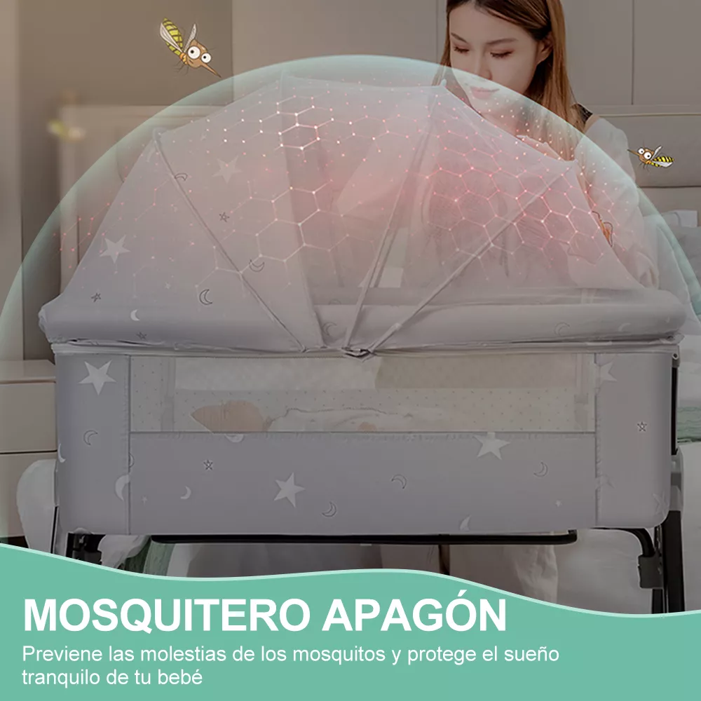El ajuste de la altura de la cuna y de la longitud de las patas permite que se adapte a cualquier tipo de cama. Un panel lateral retráctil y correas de sujeción facilitan la conexión de la cuna a la cama de los padres, proporcionando un apoyo estable y comodidad para el sueño del bebé.