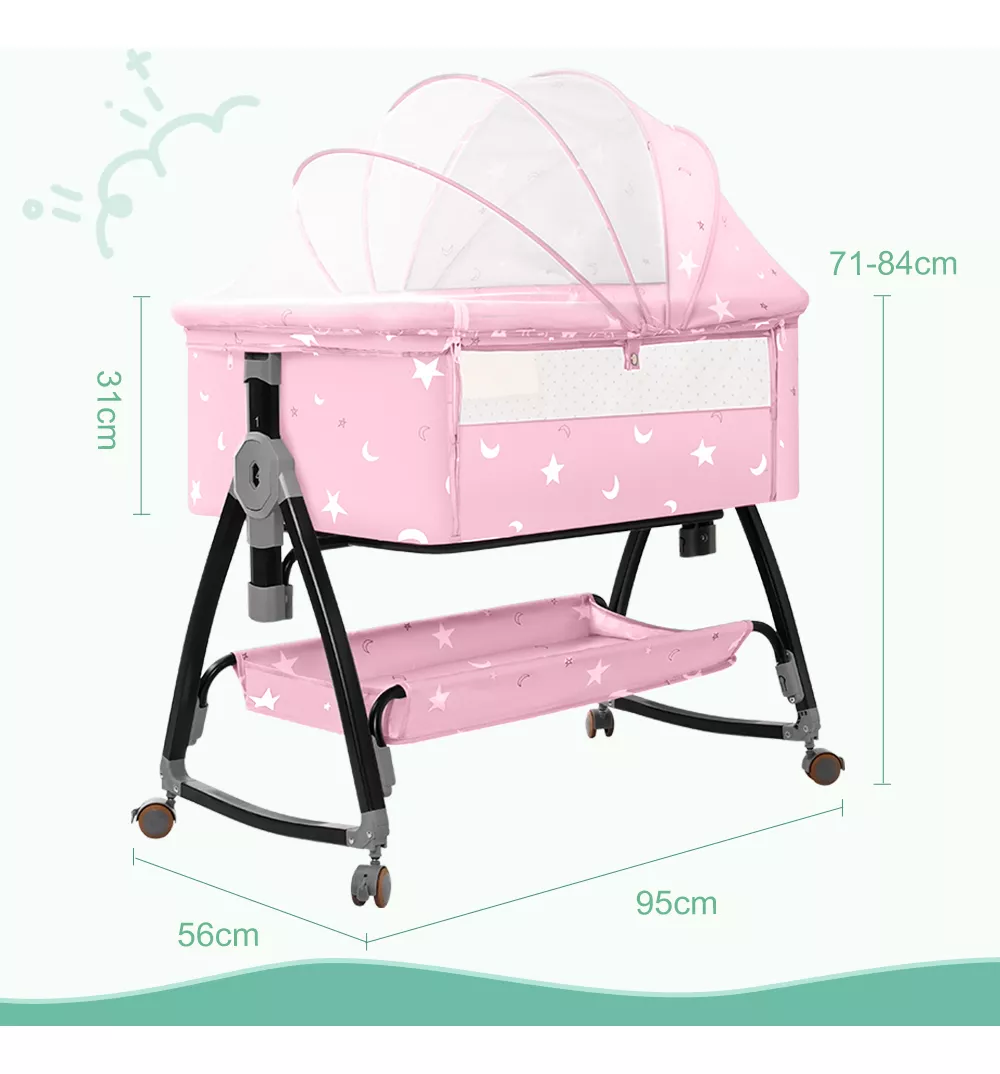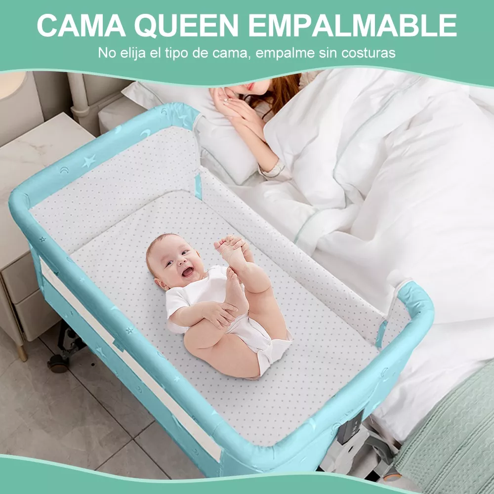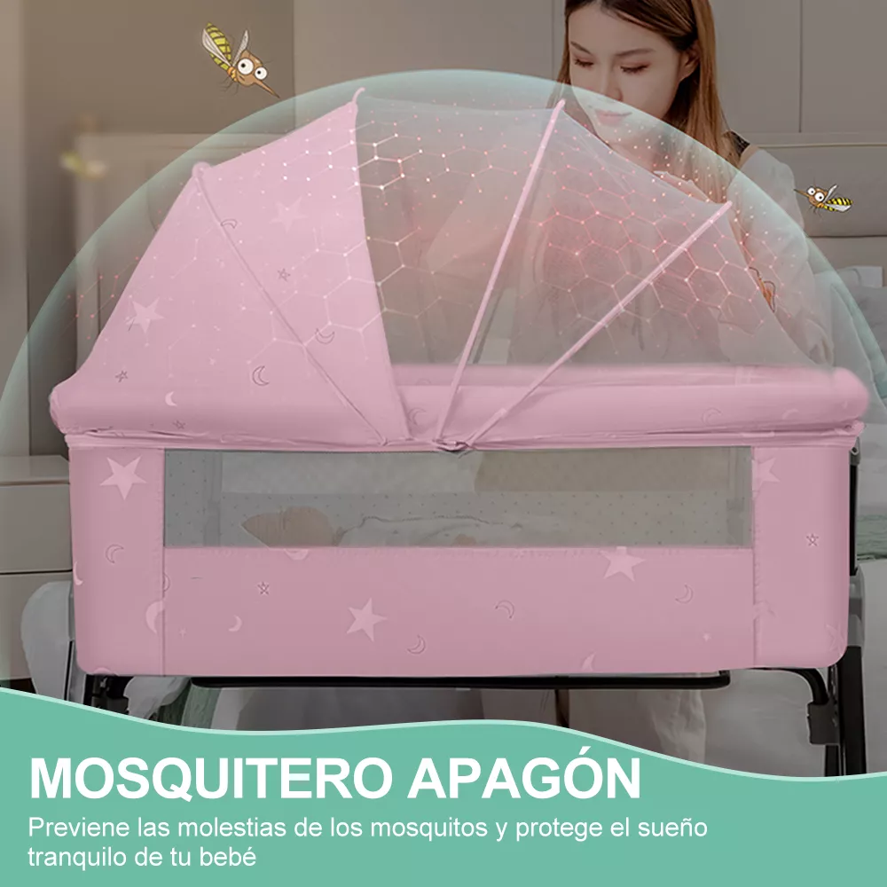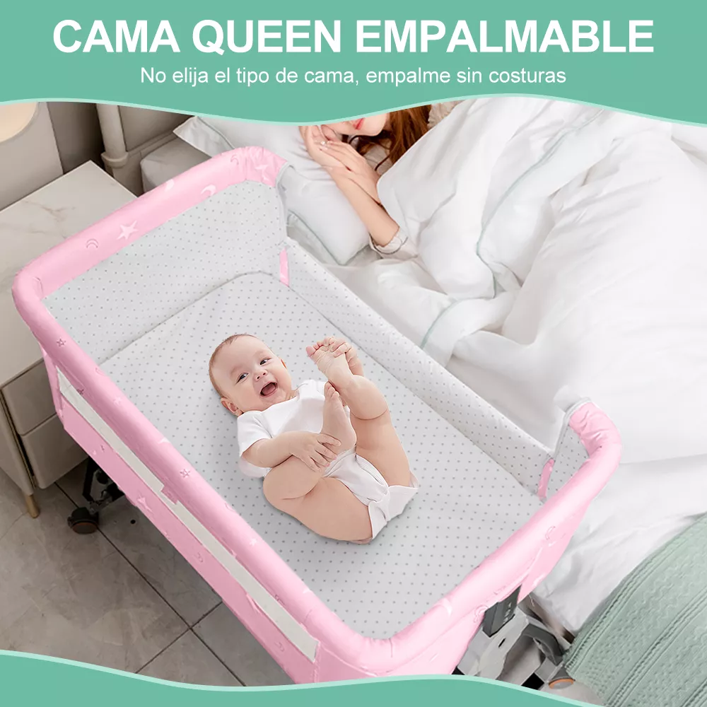 El ajuste de la altura de la cuna y de la longitud de las patas permite que se adapte a cualquier tipo de cama. Un panel lateral retráctil y correas de sujeción facilitan la conexión de la cuna a la cama de los padres, proporcionando un apoyo estable y comodidad para el sueño del bebé.