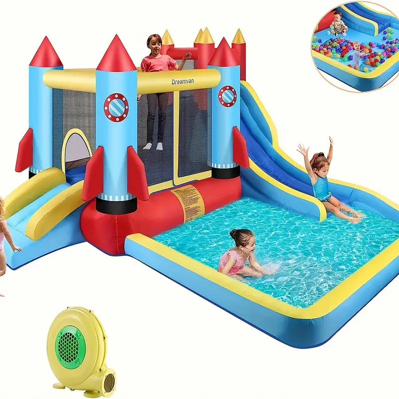 Este artículo está fabricado con PVC y está disponible en varios colores. Puede soportar un peso máximo de 140kg y utiliza un enchufe de tipo estadounidense para el inflador de aire, el cual tiene una potencia de 450W. Adecuado para niños de 3 a 12 años, mide 370x335x205cm/145.7x131.9x80.7 pulgadas y puede ser utilizado tanto en interiores como en exteriores.