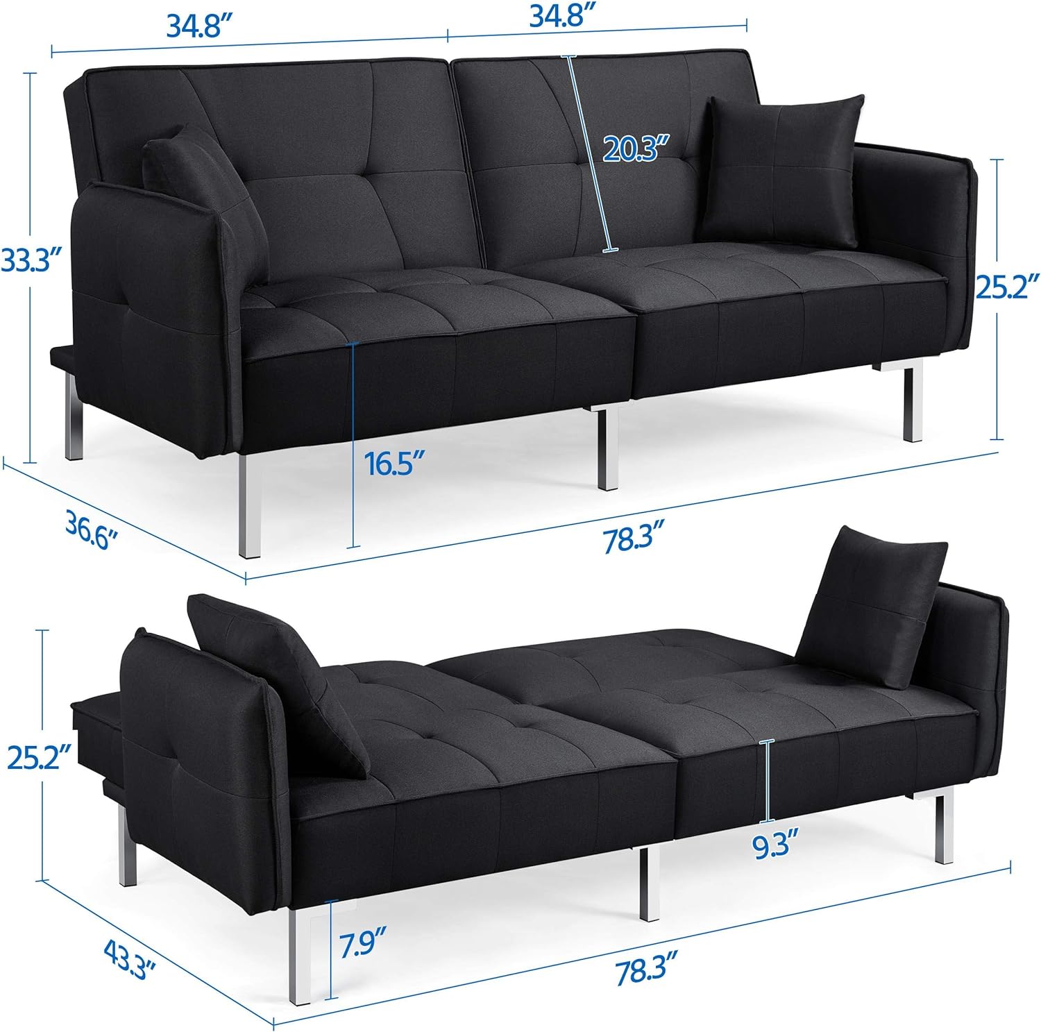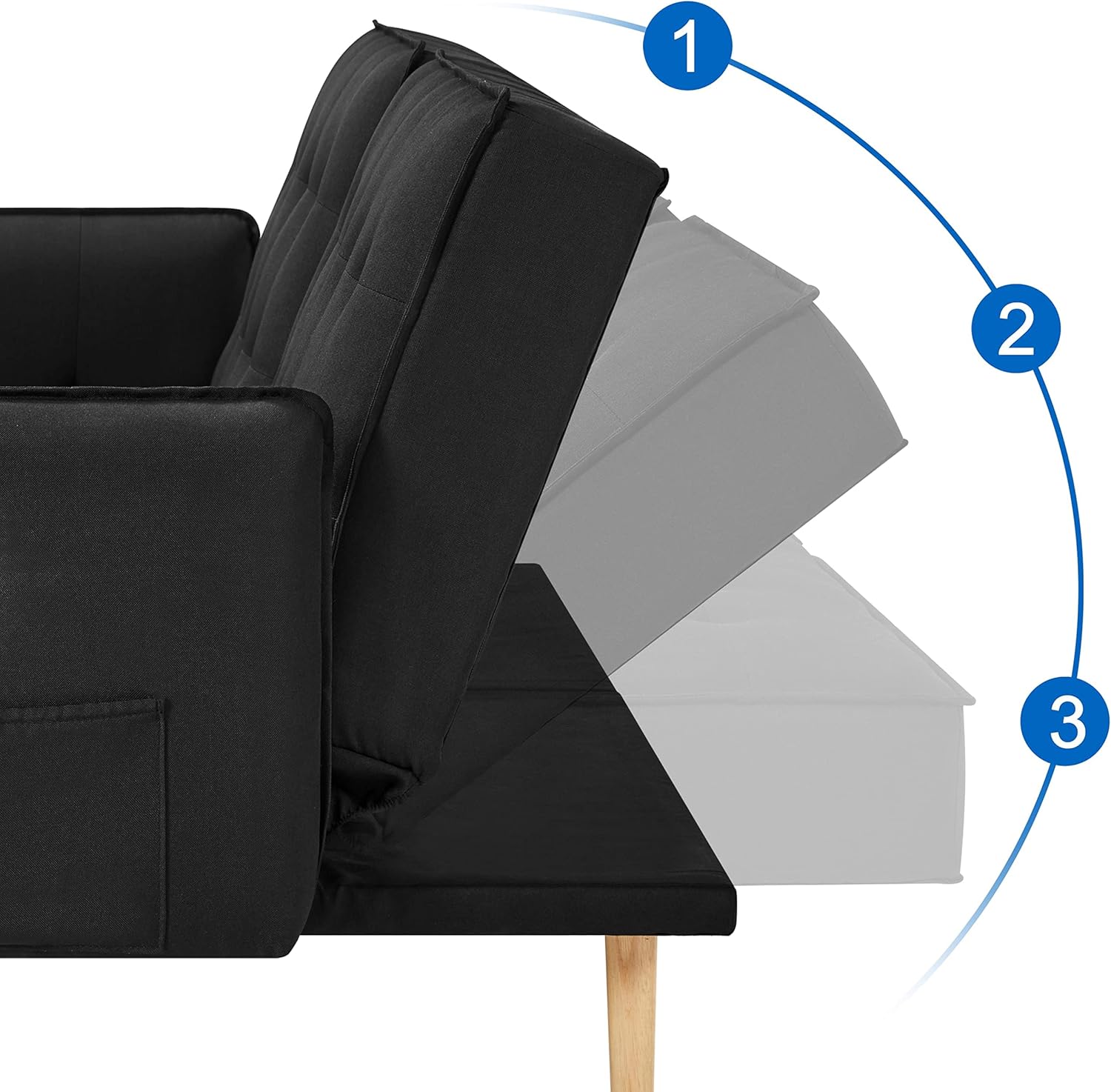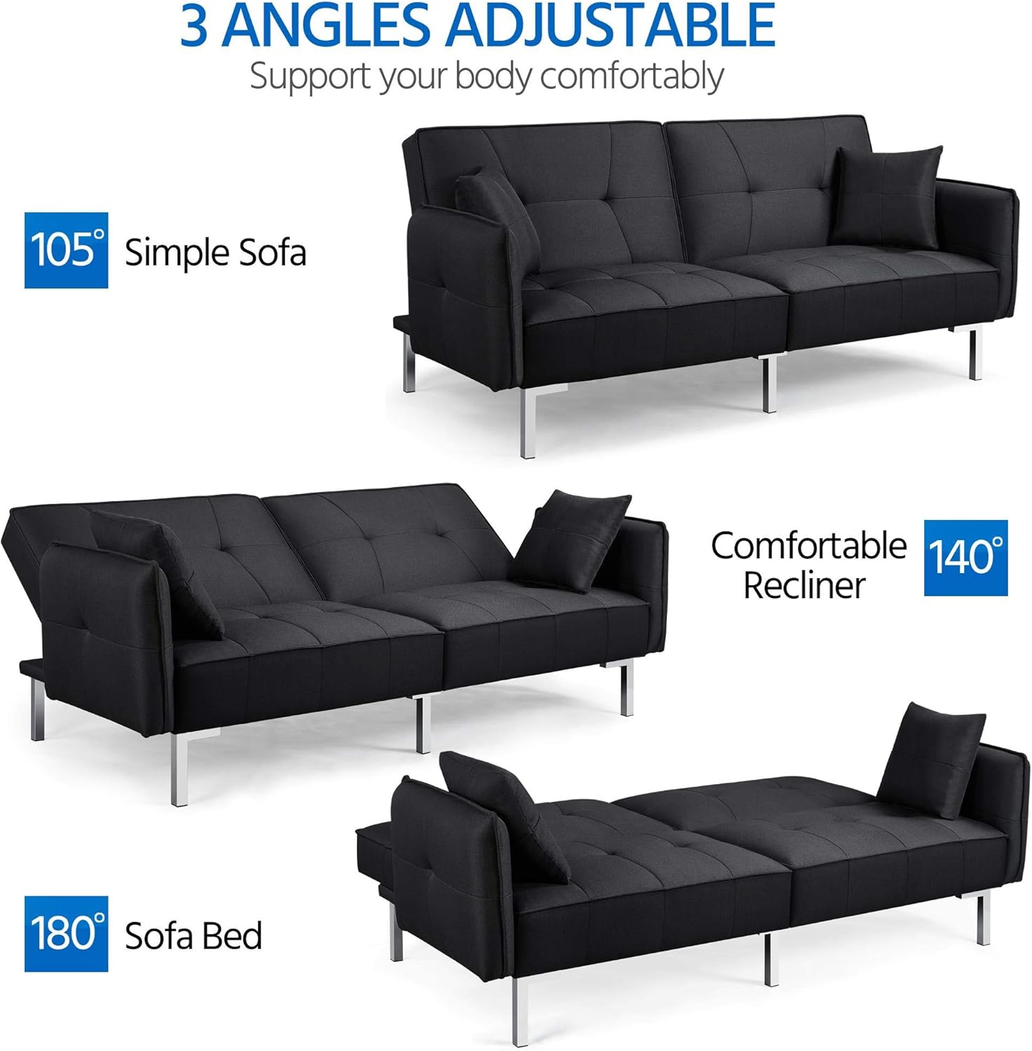 - Diseño de respaldo ajustable: la futón de la sala de estar está diseñada con un versátil ajuste de ángulo de respaldo de 3 posiciones. Un ángulo de 105 grados proporciona a tu espalda una posición ligeramente reclinada regularmente. Una posición reclinada de 140 grados podría poner menos estrés en la columna vertebral. La posición plana de 180 grados hace que el sofá sea cómodo para dormir.
