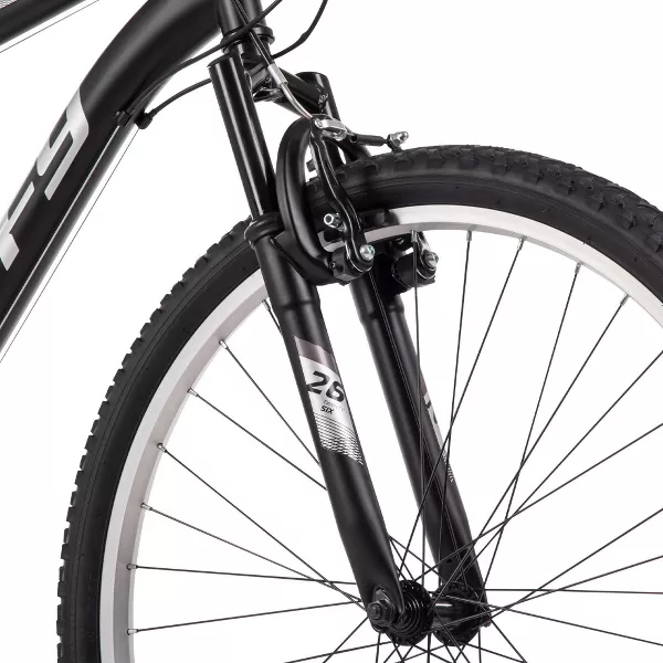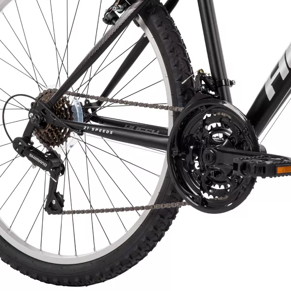 Outdoor adventures are sure to be had when riding the Huffy Highland mountain bike. This unisex mountain bike is designed for riders who typically fit a medium or large sized mountain bike frame – ideally between the height of 5’7” and 6’1”. Having a specific frame size for your bicycle helps ensure comfort while riding and to mitigate fatigue because the rider is in a more ergonomic position. The sturdy steel frame comes in matte black and has the added benefit of front suspension. Stay in control of your cadence, speed, and overall experience thanks to the 21-speeds, front and rear steel linear pull brakes, and all-terrain tires. This bike is ready to go wherever you are.