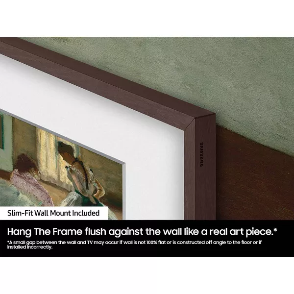 Slim-Fit Wall Mount Included - Hang The Frame flush against the wall like a real art piece. Less gap between your TV and wall means you get a sleeker look.* *A small gap between the wall and TV may occur if wall is not 100% flat or is constructed off-angle to the floor or if installed incorrectly.