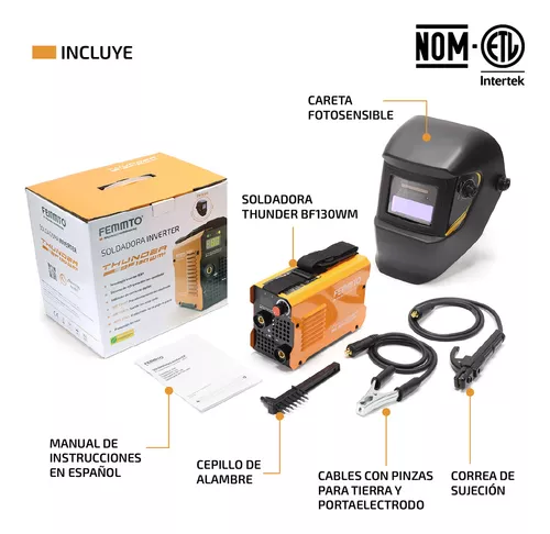 Descubre la potencia de la Soldadora Inverter FEMMTO THUNDER 130 junto con la innovación de la Careta Fotosensible, la combinación perfecta para soldar con confianza en cualquier entorno. Con un display digital y características de vanguardia, esta soldadora te ofrece una soldadura estable y precisa en casa o taller.