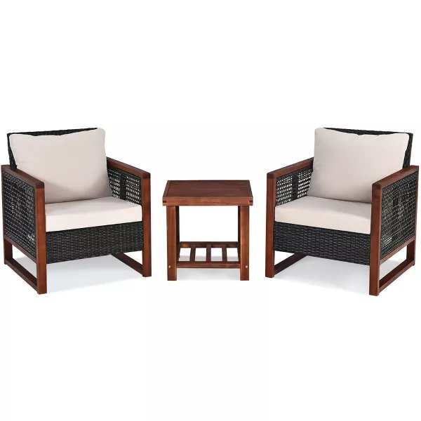 Made of high quality PE rattan, our wicker bistro set with wood frame is weather-resistant and durable enough for long term use. And the sturdy structure enhances the stability and weight capacity. The chair has wide armrest and backrest can provide a comfortable experience for you, so you can have a good relaxing. What's more, the bistro set includes a coffee table, which has 2 storage shelves for convenient use. The stylish design and classic appearance allow the conversation set to fit any surroundings. You can use it in anywhere you like, such as garden, balcony, or backyard!
