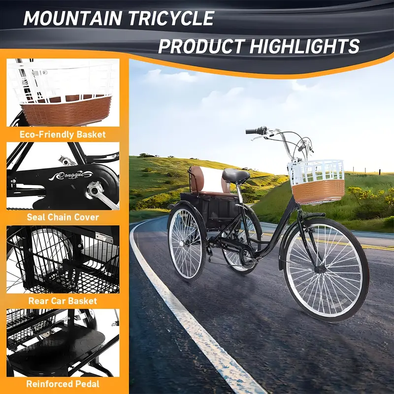 Trike para adultos seguro: este triciclo está equipado con neumáticos de goma antideslizantes y ruedas de radios, que pueden conquistar fácilmente caminos de grava, tierra y piedra; la horquilla delantera está diseñada con amortiguación neumática, que puede filtrar fácilmente los baches en el suelo, haciendo que el viaje sea más ligero y cómodo.