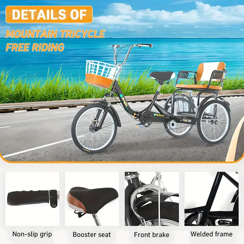 Triciclo para adultos con asiento trasero: El asiento trasero acolchado puede transportar hasta dos niños o un adulto con diseño de cinturón de seguridad, el marco de acero al carbono estable y el sistema de suspensión resistente pueden proporcionar una experiencia de conducción suave y un ciclismo más seguro.