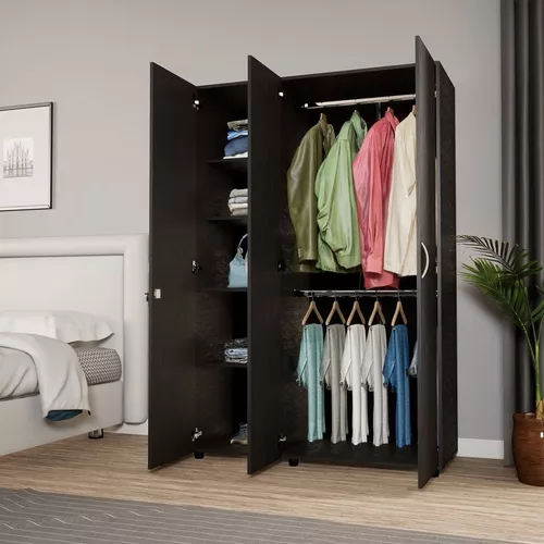 Ropero Bilbao 120 cm, diseñado para organizar tu dormitorio con colgadero superior e inferior y un compartimiento lateral con entrepaño para acomodar ropa doblada. Cuenta con 3 puertas abatibles con manijas de aluminio. Fabricado con madera aglomerada de alta resistencia y acabado en melamina, proporciona estabilidad y durabilidad. Incluye rieles y bisagras metálicos para un funcionamiento óptimo.