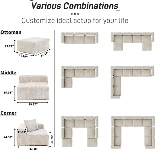 El sofá modular está hecho de pana de alta calidad, que es suave, resistente al desgaste, resistente a las arrugas y no se deforma. Después de un uso prolongado, quedará como nuevo. Puede brindar una sensación suave y cómoda, como sentarse en una nube. Ya sea que desees relajarte o disfrutar de una buena lectura, este sofá te ofrecerá una experiencia increíblemente cómoda.