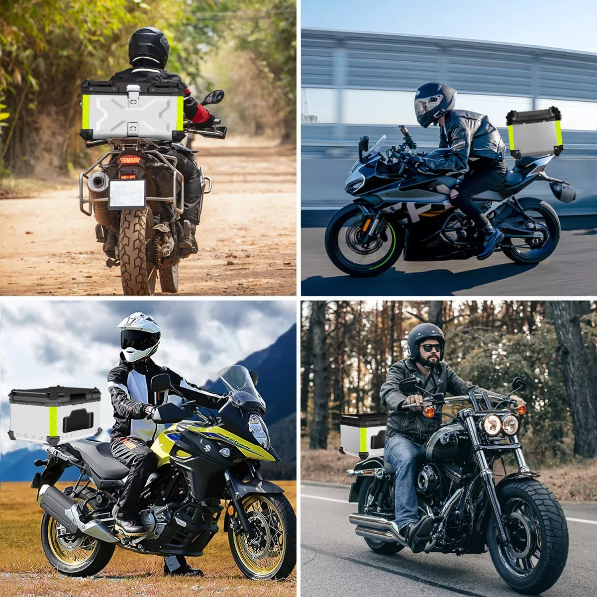 La caja superior de la motocicleta está diseñada con una base de bloqueo de llave, lo que reduce el riesgo de robo de la base extraíble. Cuando el portón trasero está bloqueado, se bloquea en la base a la que está conectado, protegiendo perfectamente los artículos almacenados contra robos. Estamos equipados con 2 pegatinas reflectantes de seguridad, que son impermeables y duraderas, y tienen un buen efecto reflectante por la noche, lo que puede protegerlo por la noche.