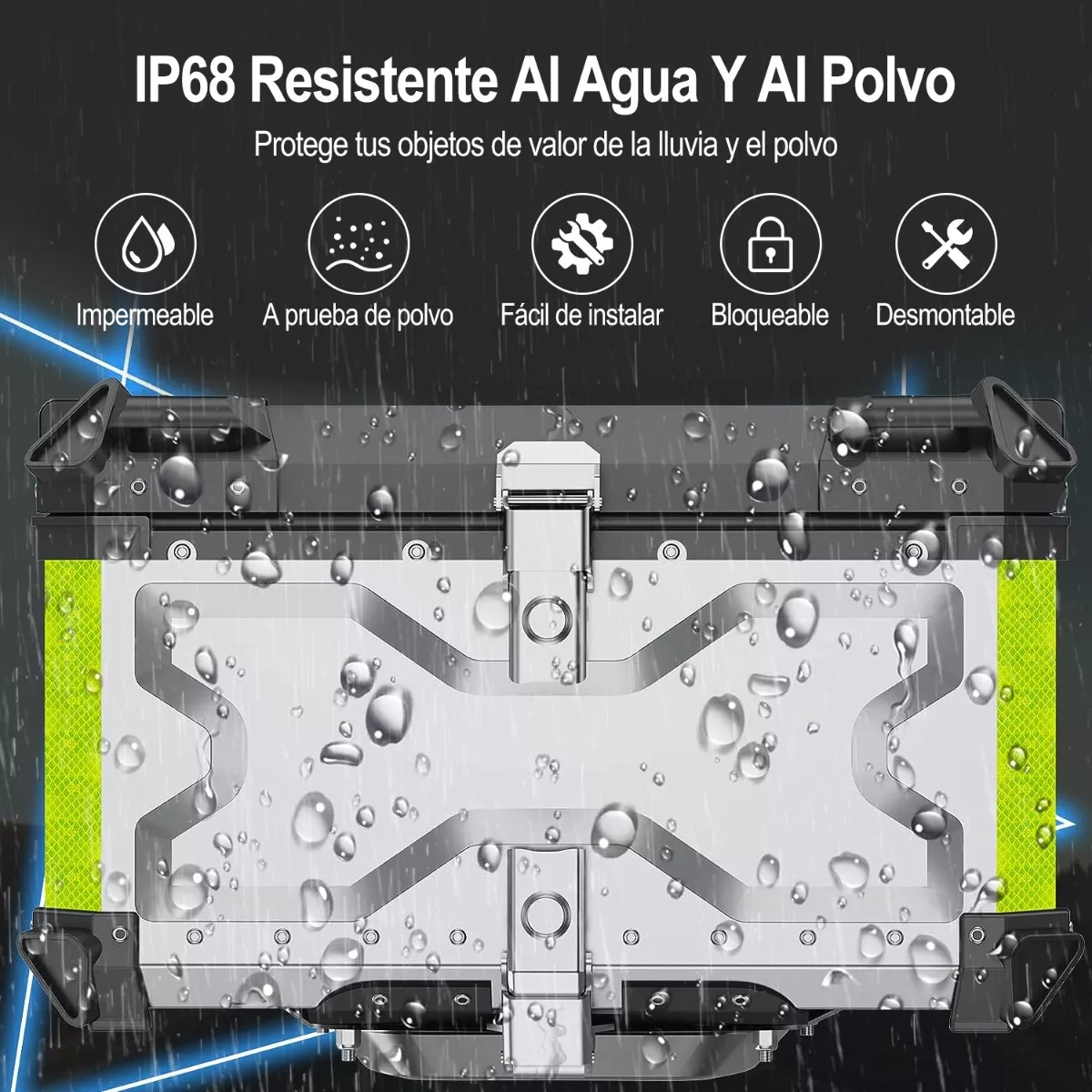 La carcasa superior de la motocicleta adopta un alto nivel de protección estándar, tira de sellado de alta elasticidad incorporada, mordida apretada, sin fugas, nivel 6 a prueba de polvo y nivel 8 a prueba de agua, puede proteger sus artículos de la lluvia y el polvo incluso en días lluviosos, no hay necesidad de preocuparse sobre los cambios de tiempo.